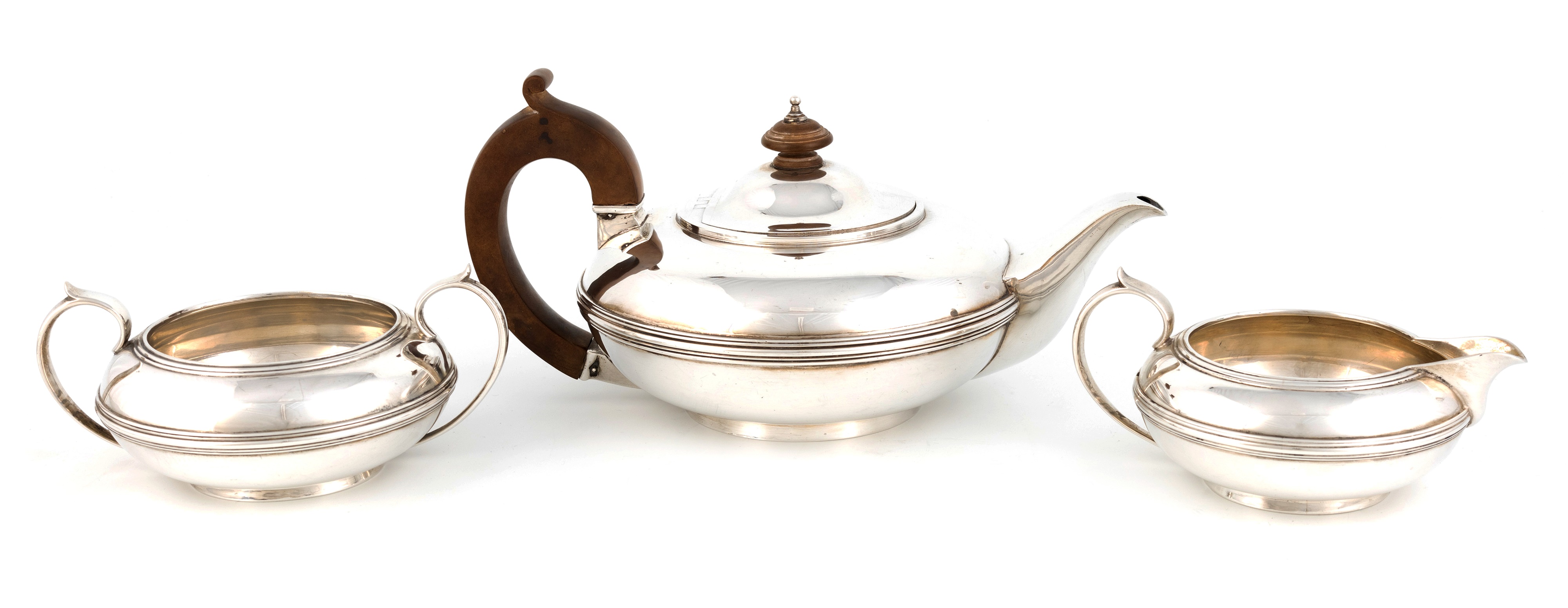 circular form with a reeded girdle, scroll handles, length handle to spout 24cm, total approx. weight 32.7oz. (3)
