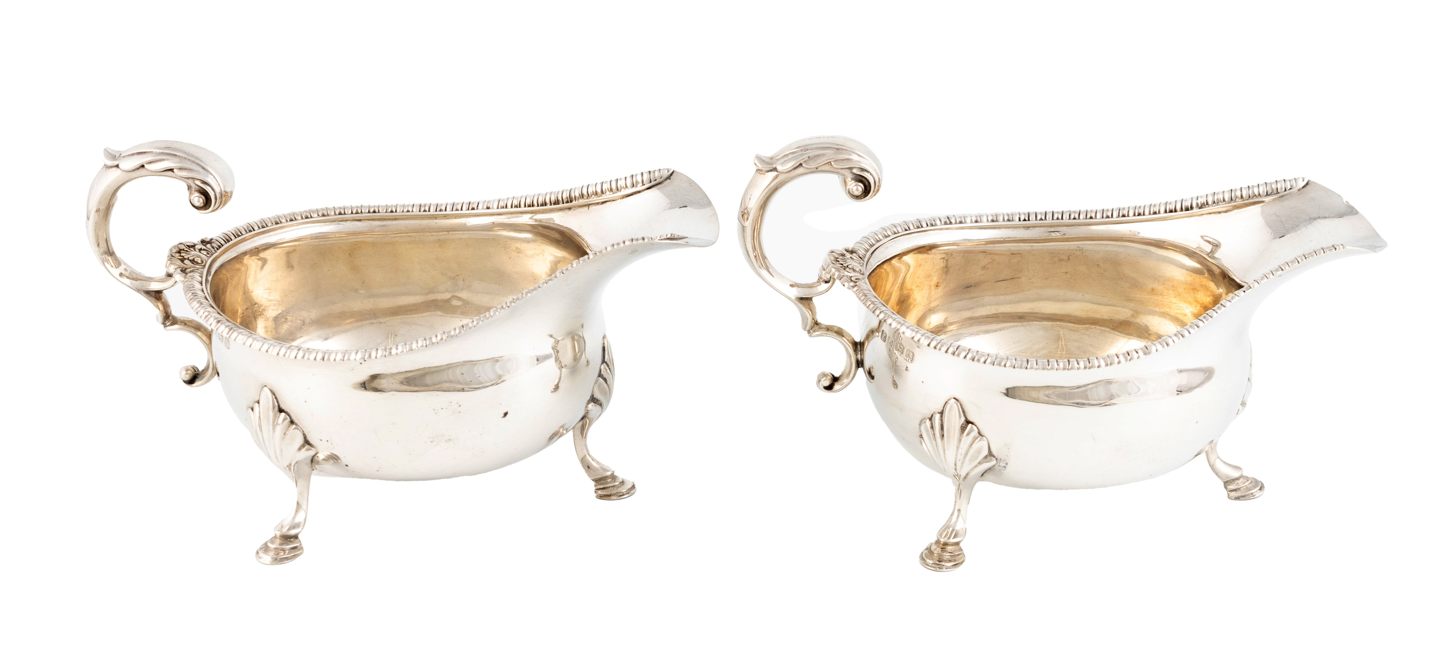 oval form with gadrooned edges, on three leaf-capped hoof feet, length 17.5cm, total approx. weight 11.8oz. (2)