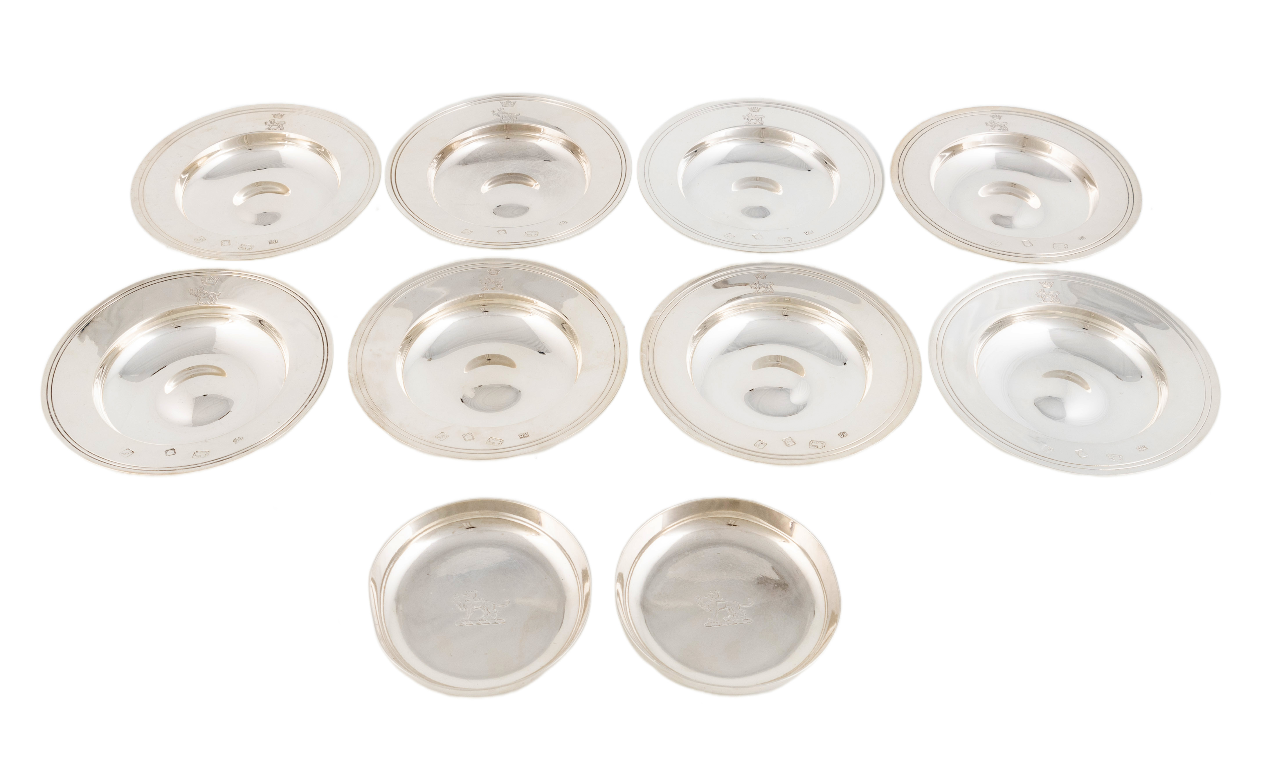 plain circular form engraved with crowned crests, diameter 11.6cm, plus two modern silver dishes by Asprey & Co Ltd, London 1959, total approx. weight 31.9oz. (10)