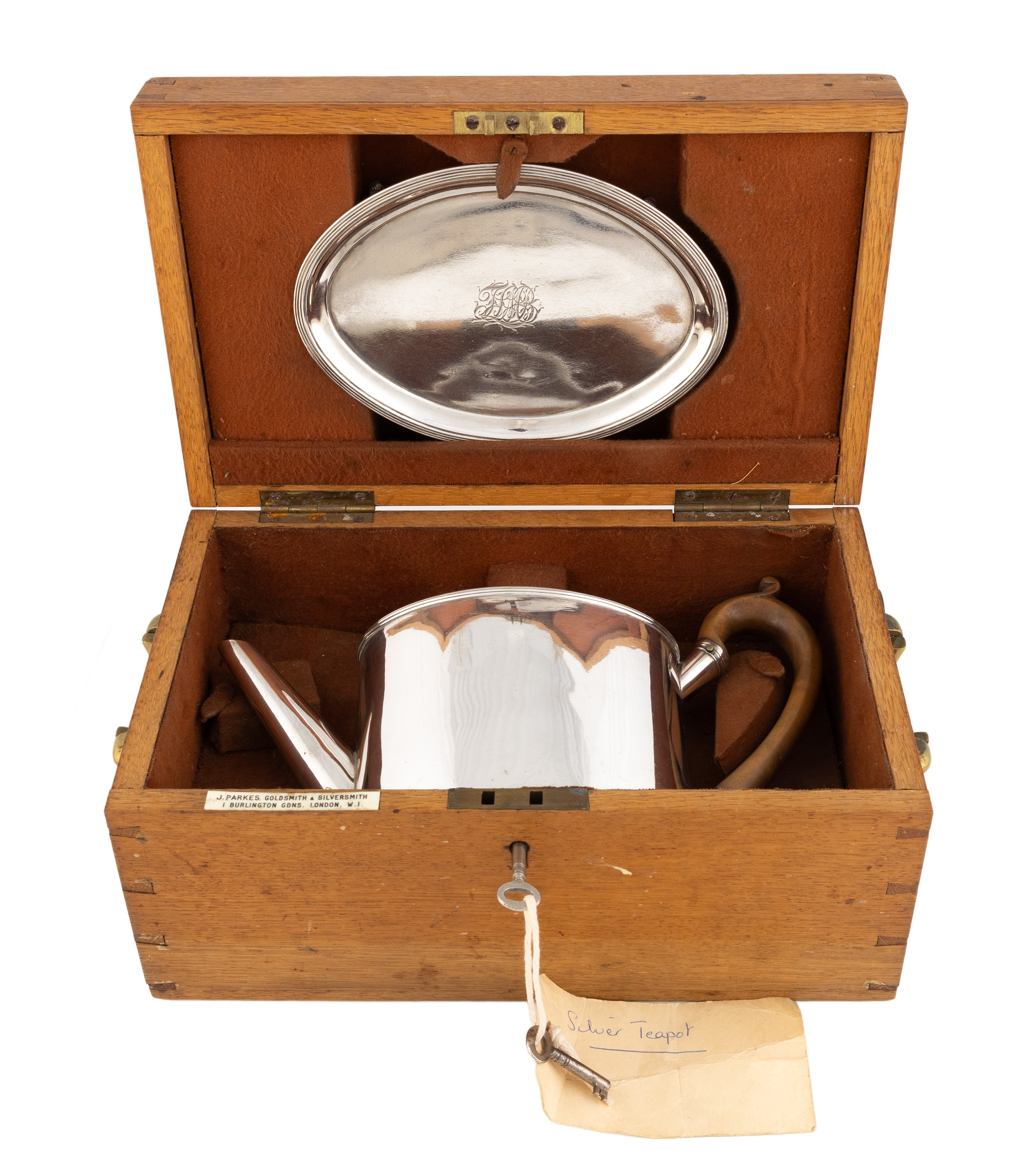 plain oval form, wooden scroll handle, reeded borders, initialled, the stand of oval form on four bracket feet, in a fitted wooden box, length handle to spout 26.2cm, approx. weight 23.3oz. (2)