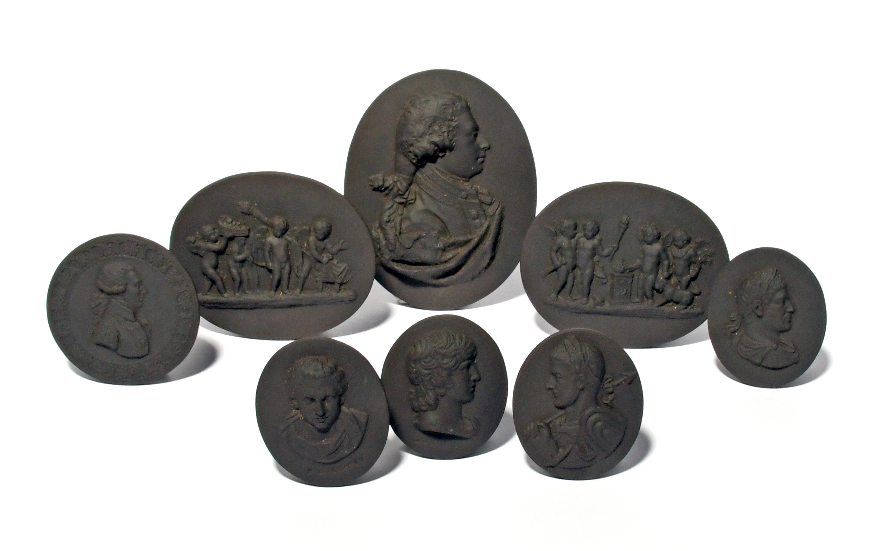 A pair of Wedgwood black basalt plaques, 19th century, of the Marriage of Cupid and Psyche, each modelled by John Flaxman with four putti, four small basalt portrait plaques of Classical figures and poets including Posidippus and Antinous, and two further portrait plaques of Georgian gentlemen, unmarked, 9.2cm max. (8)