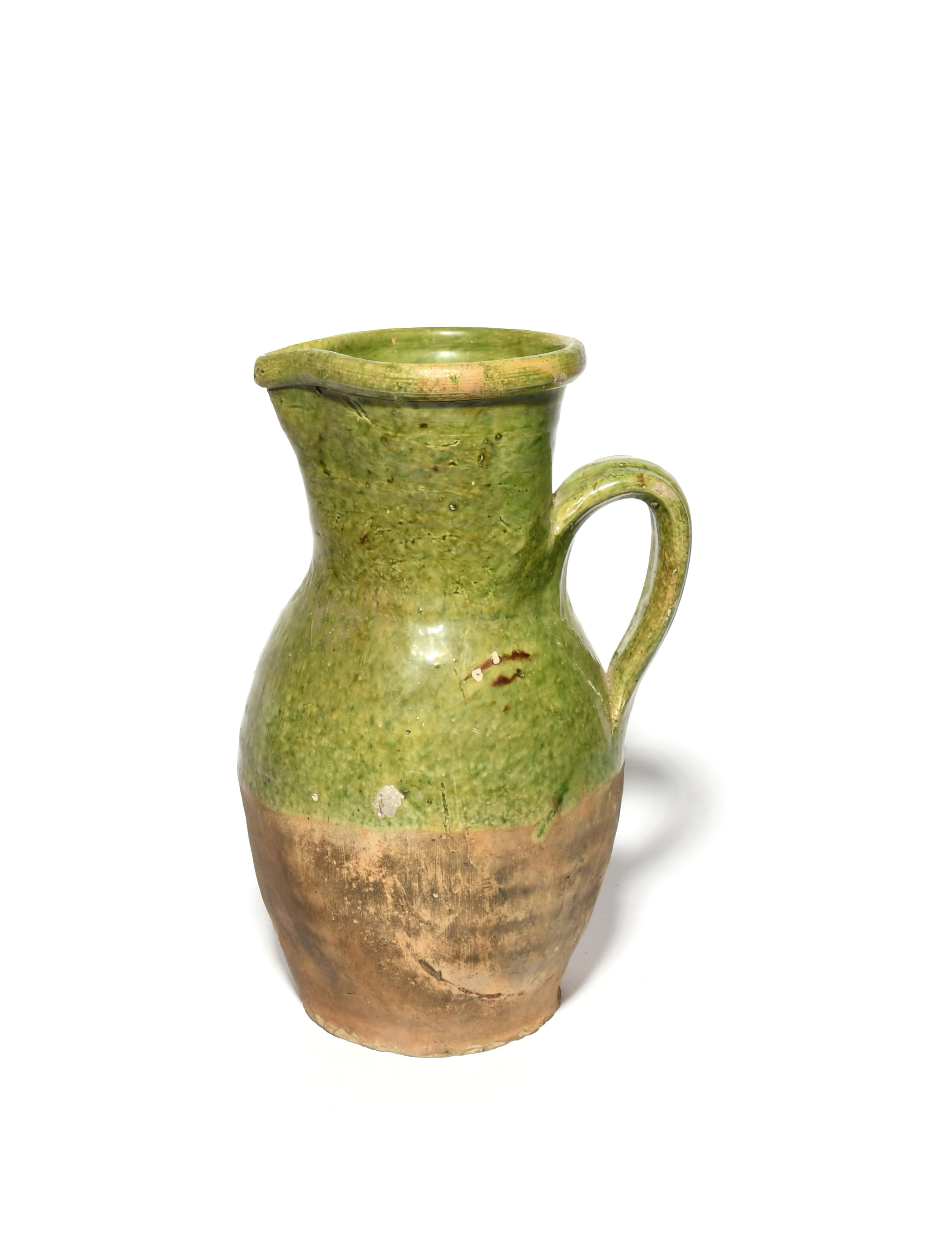 A large post-medieval Tudor Green jug, 2nd half 16th century, the tall earthenware form decorated to the upper half in a rich apple green, with a wide strap handle, a crack to the rim, 28.3cm.