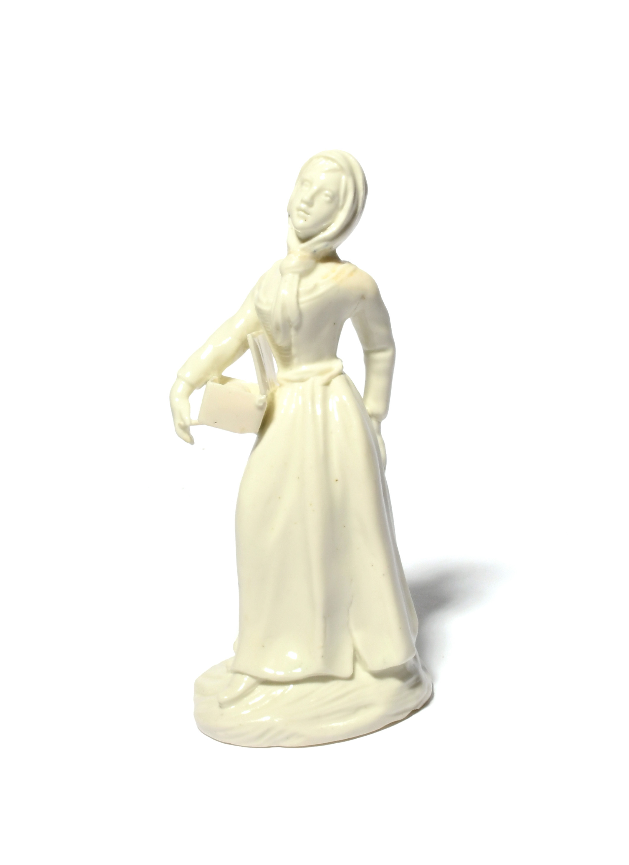A French porcelain figure of a girl, mid 18th century, wearing a simple dress and a tied headscarf,