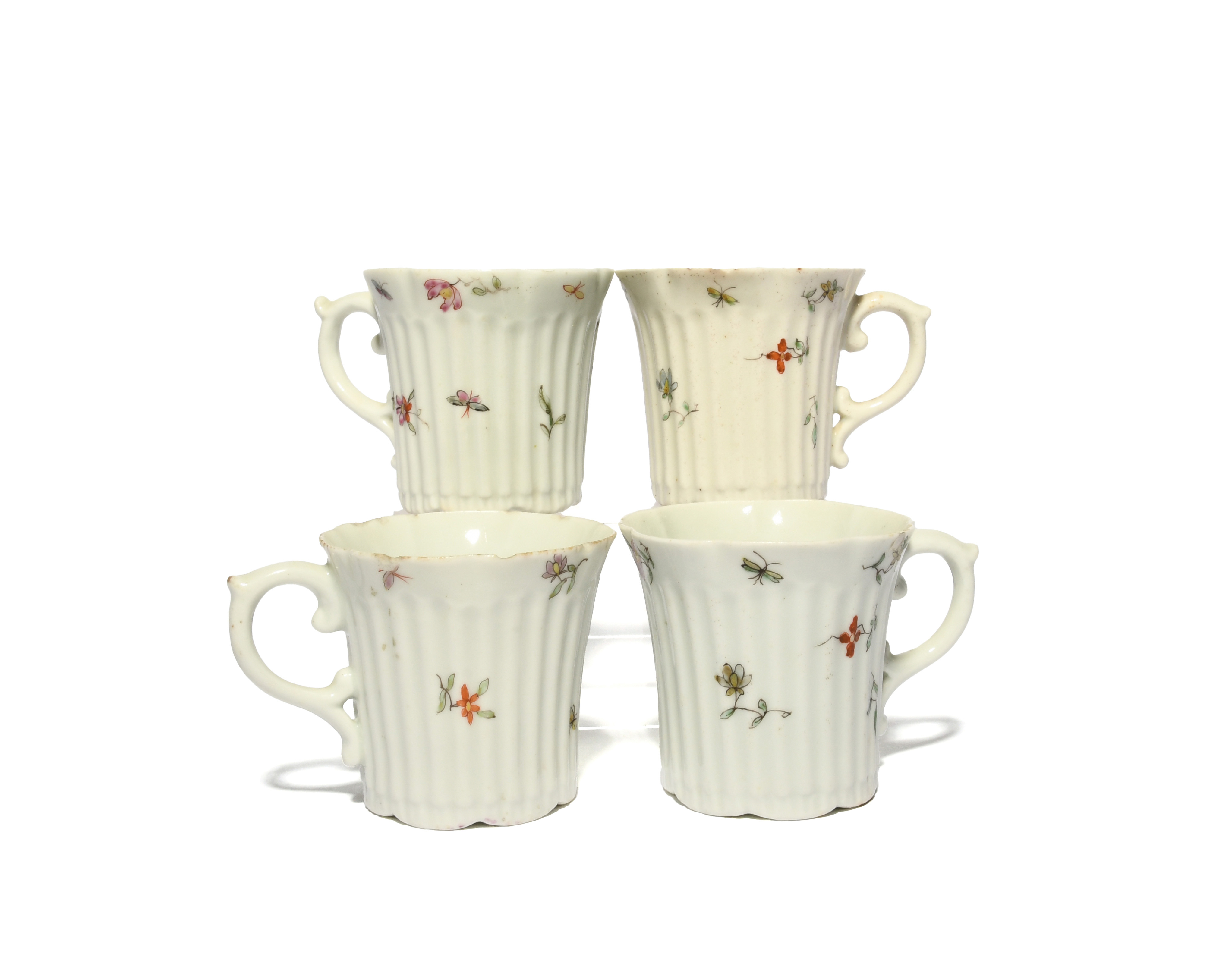Four early Worcester coffee cups, c.1753-55, of lobed and reeded form, sparsely painted with small flower and leaf sprigs, and with flying insects in famille rose enamels, with scroll handles, minor damages, 5.5cm. (4)