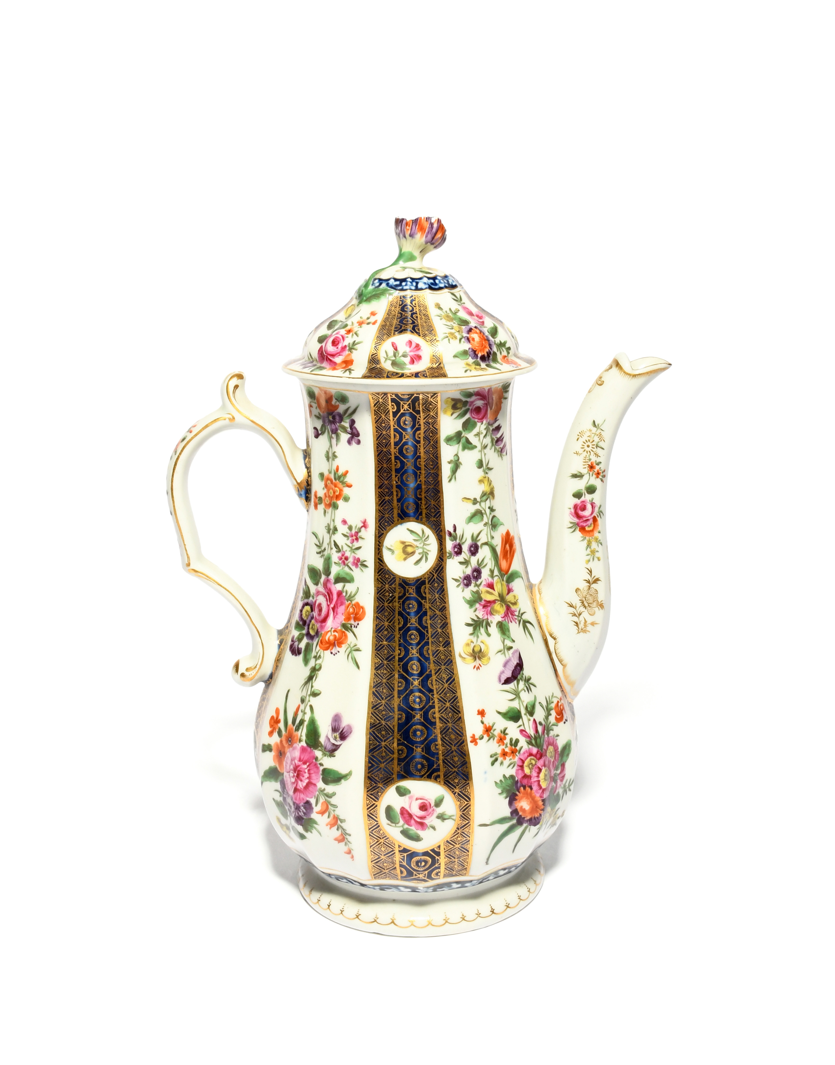 A fine Worcester coffee pot and cover, c.1765, the baluster body of Warmstry-fluted form, finely painted with polychrome flowers alternating with vertical blue bands enclosing small floral panels and highlighted with geometric gilt designs, blue square seal mark, 24.5cm. (2)