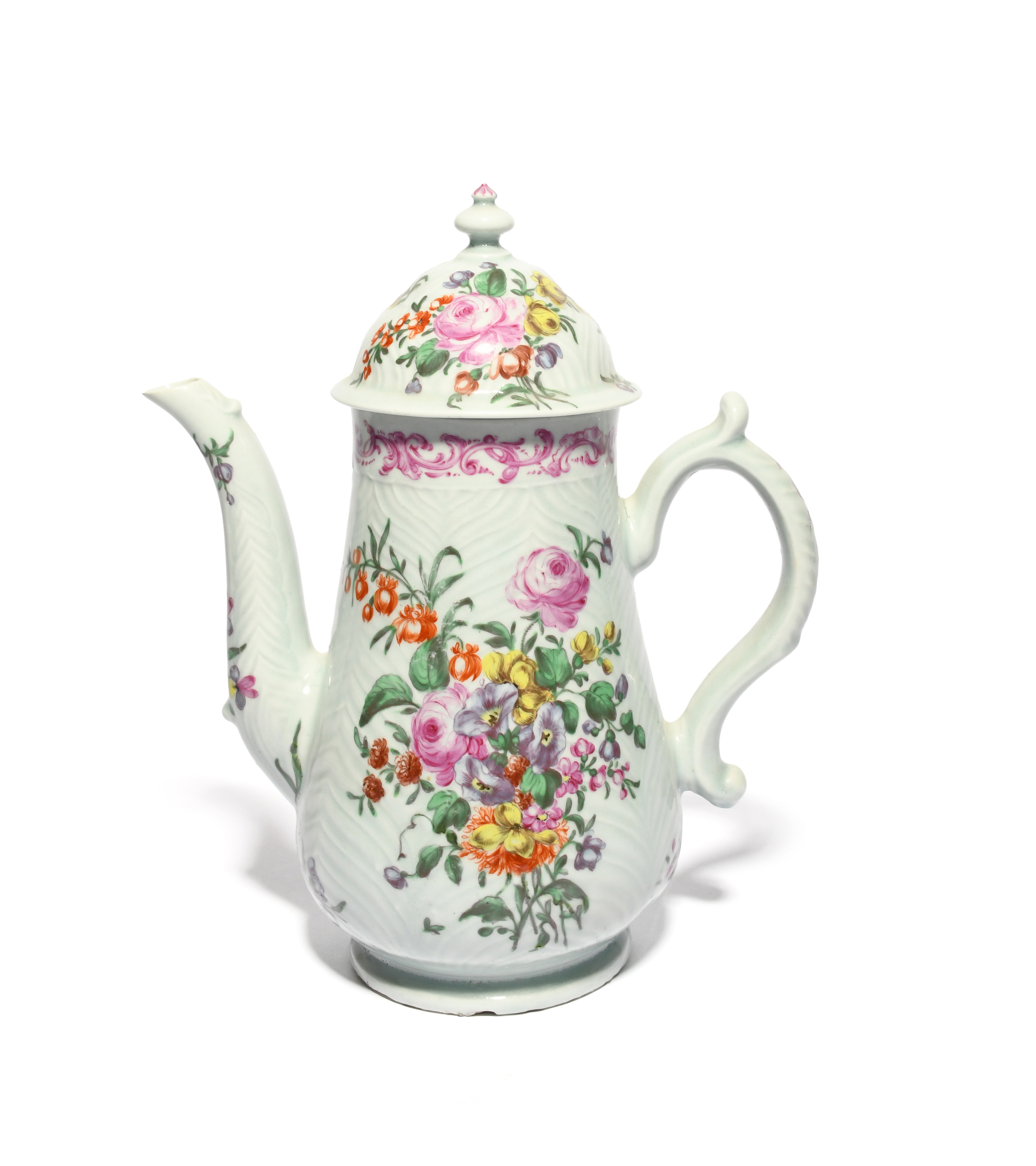 A large Worcester coffee pot and cover, c.1756-58, the feather-moulded body finely painted with polychrome flower sprays beneath a puce scroll border, the spout with a sprig of heartsease, a little good restoration to the spout, 25.3cm. (2)