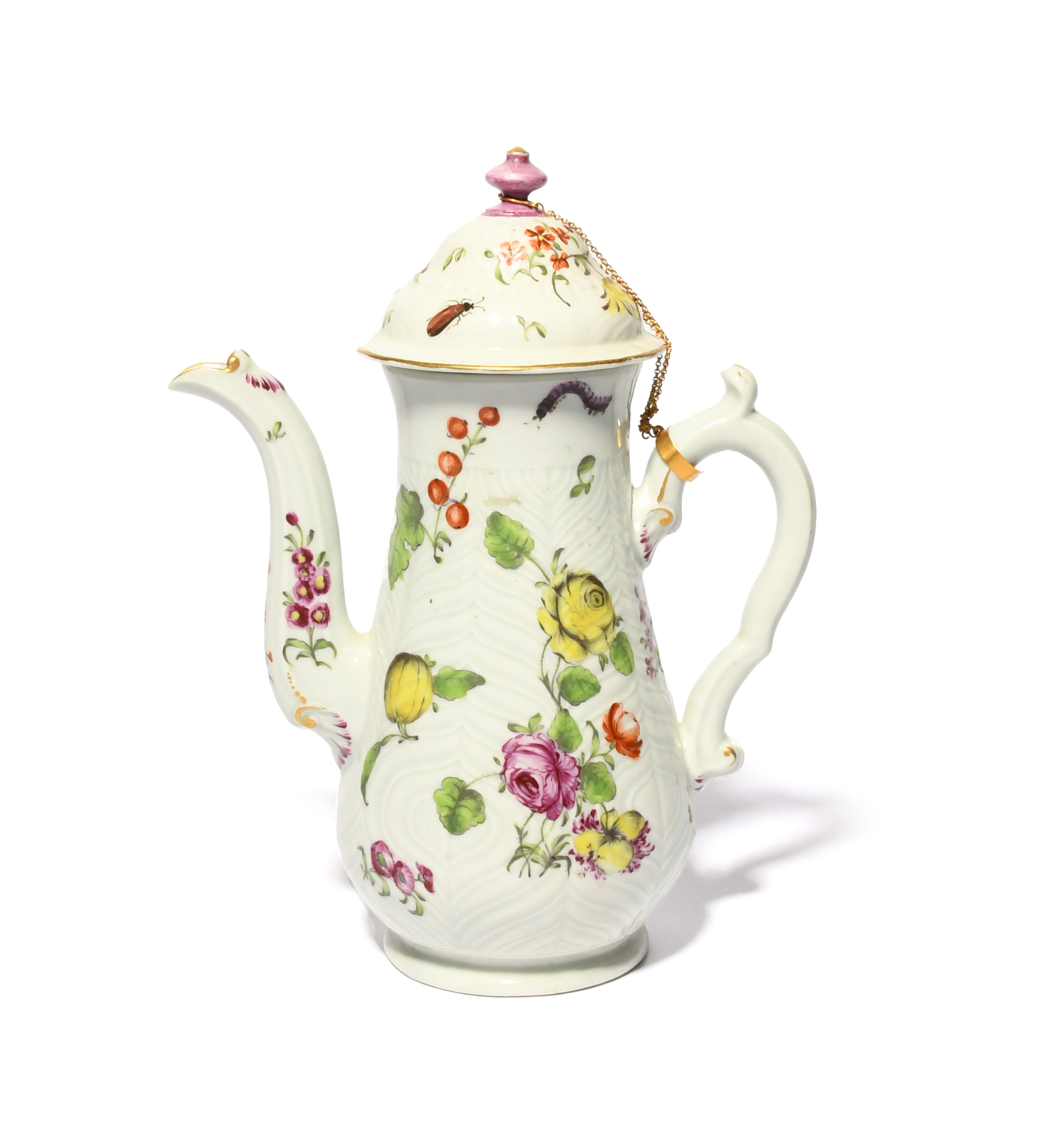 A rare London-decorated Worcester coffee pot and cover, c.1756-58, the small feather-moulded form painted by an outside decorator with sprays of fruit and flowers including a large strawberry and a caterpillar, with a gilt chain linking the handle and cover, a restored rim chip to the cover, 23cm. (2)