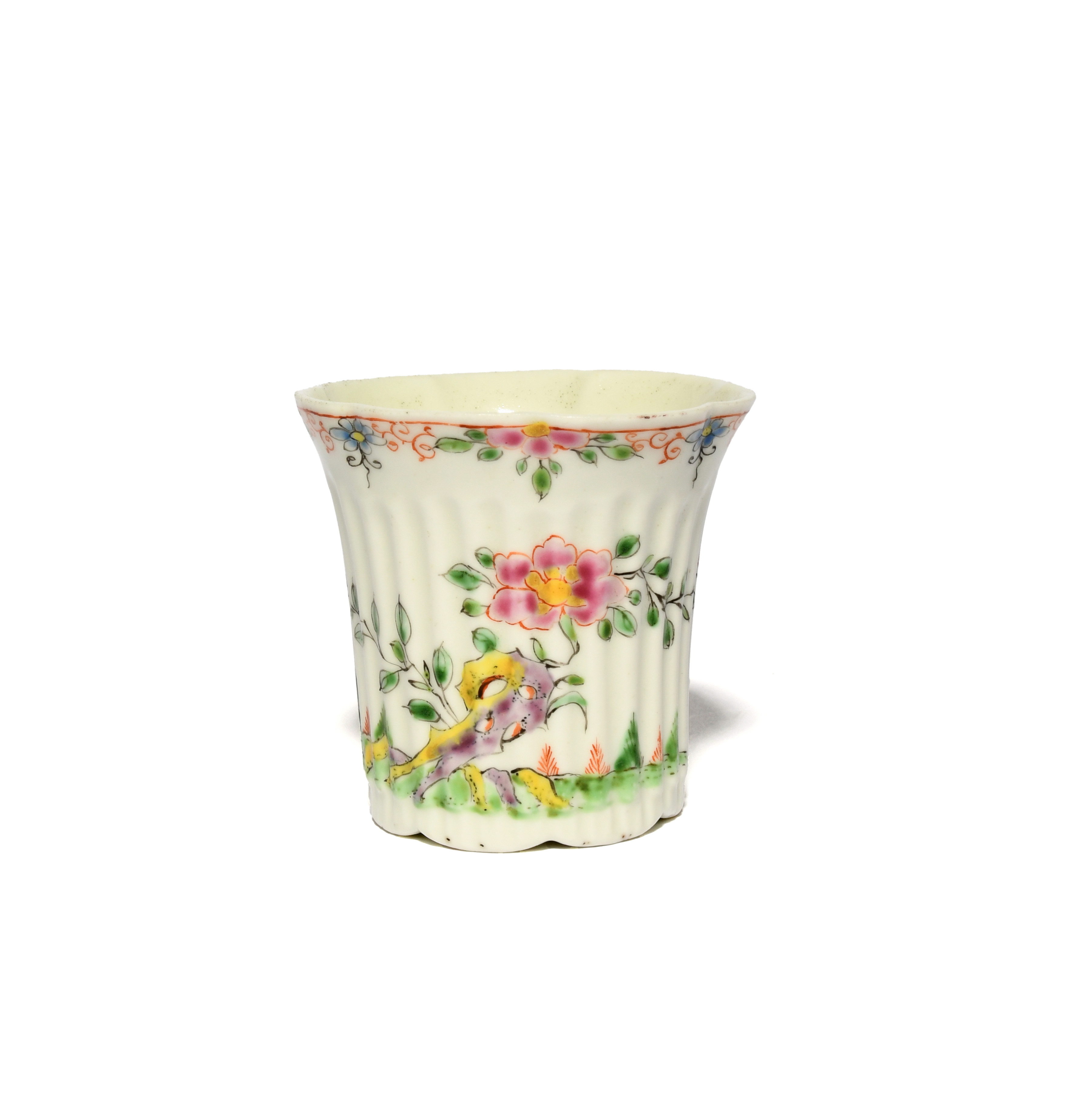 An early Worcester coffee cup, c.1753-55, the reeded form finely painted in the Oriental manner with a flowering peony tree before distant pine trees, the lobed rim with a formal flowerhead border in famille rose enamels, a small rim chip, 5.3cm.