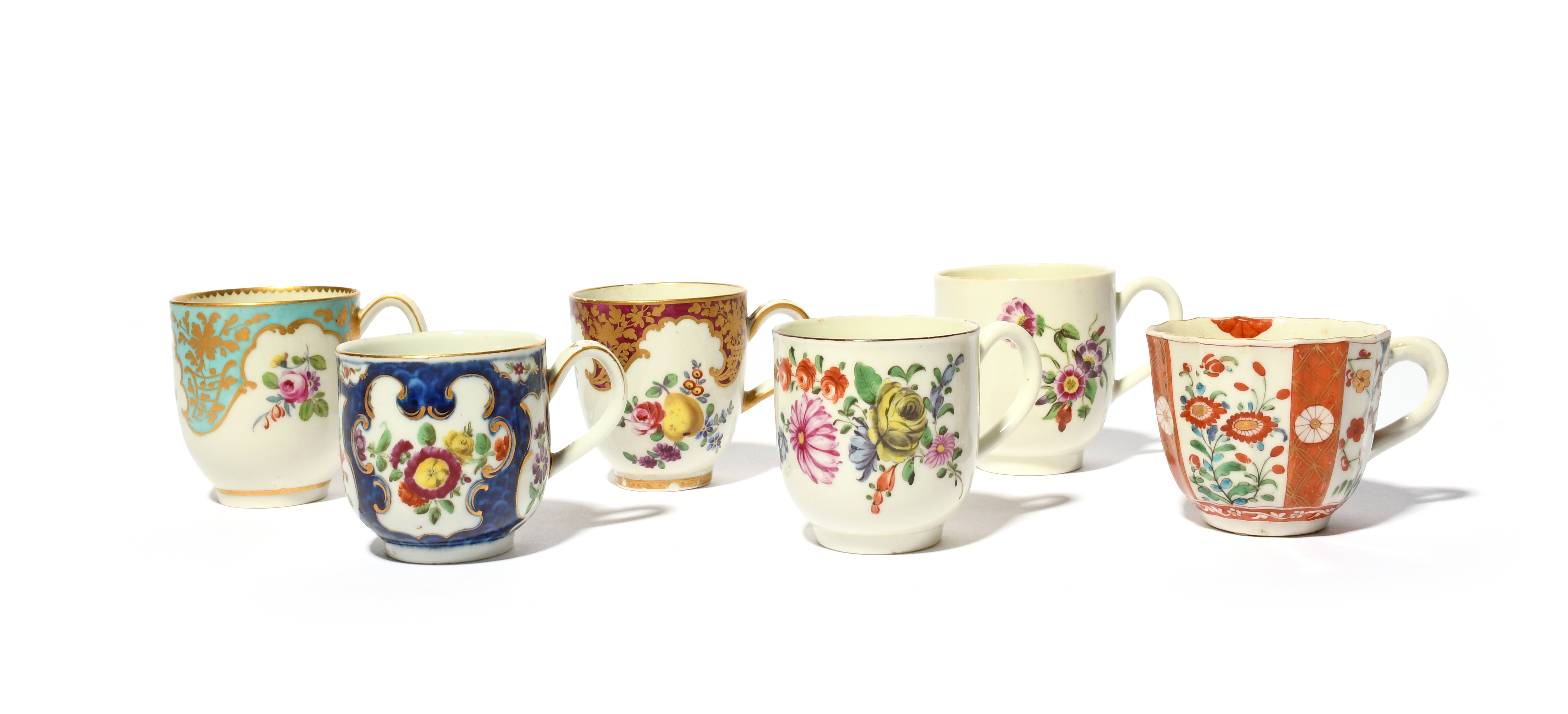 Six Worcester coffee cups, c.1760-75, one painted in the manner of the Hope Edwardes service,