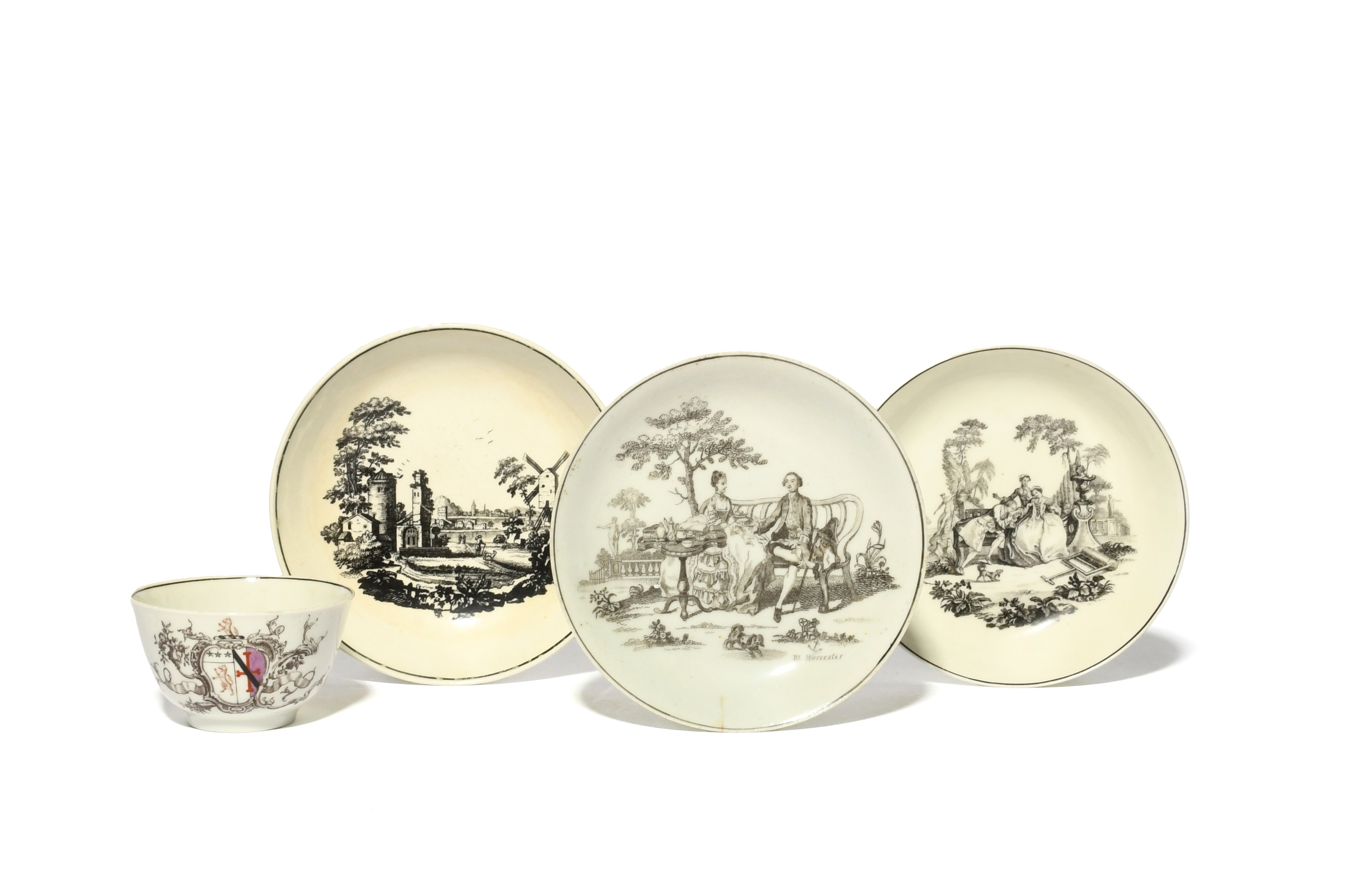 A Worcester armorial teabowl and three saucers, c.1758, the teabowl painted in black with a shield and later enamelled with the arms of Wilson impaling Langton, the reverse with the Tea Party, one saucer with the same print, another with L'Amour, the last with a landscape including a windmill, 12.5cm max. (4)