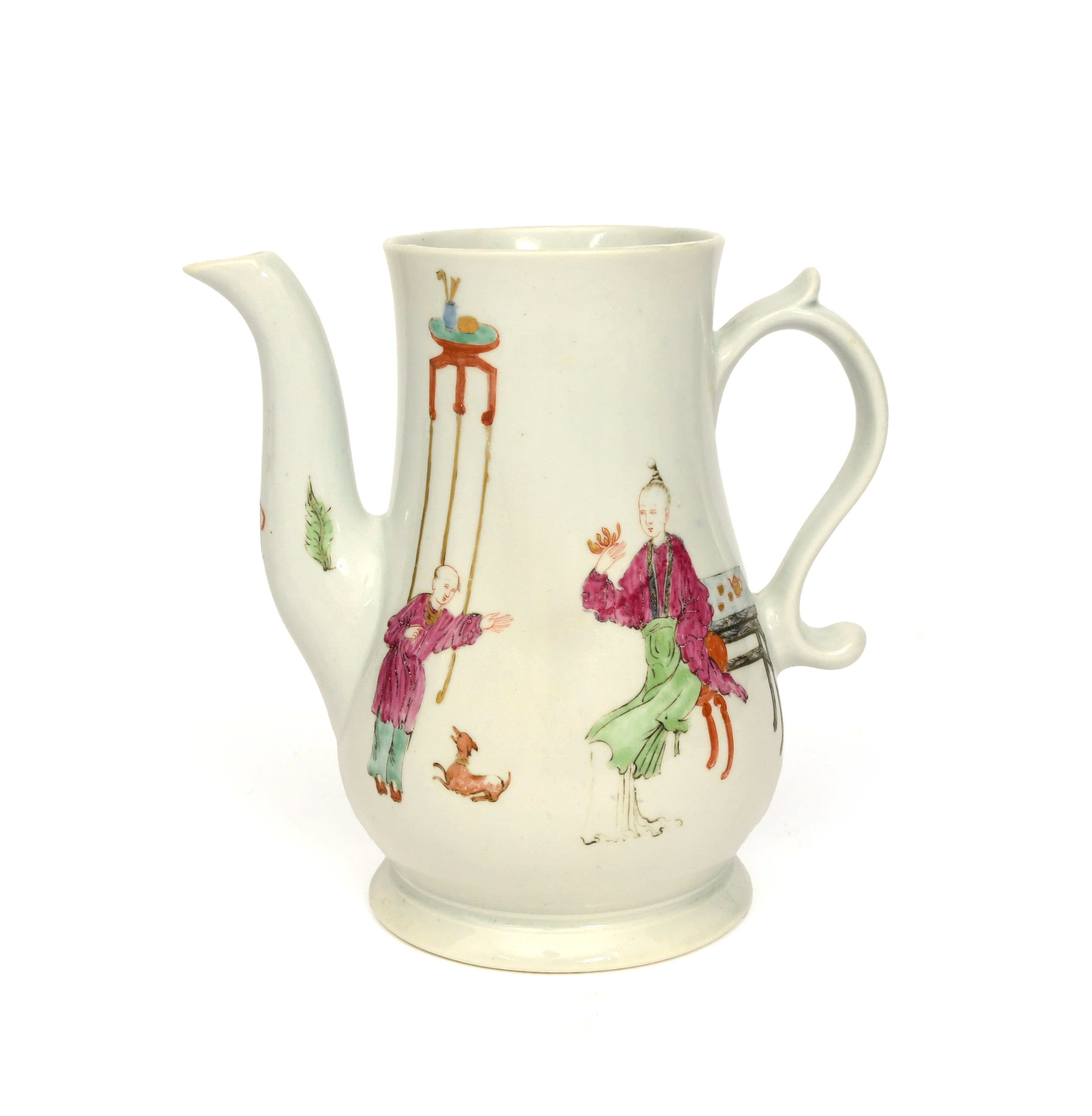 A Worcester 'Scratch Cross' coffee pot, c.1753-55, the pear-shaped body painted in polychrome enamels, one side with a Chinese boy and his dog beside his mother seated at a tea table, the reverse with two Chinese figures beneath a long-tailed bird perched on a stand, the cover lacking, some good restoration, 14cm high.
