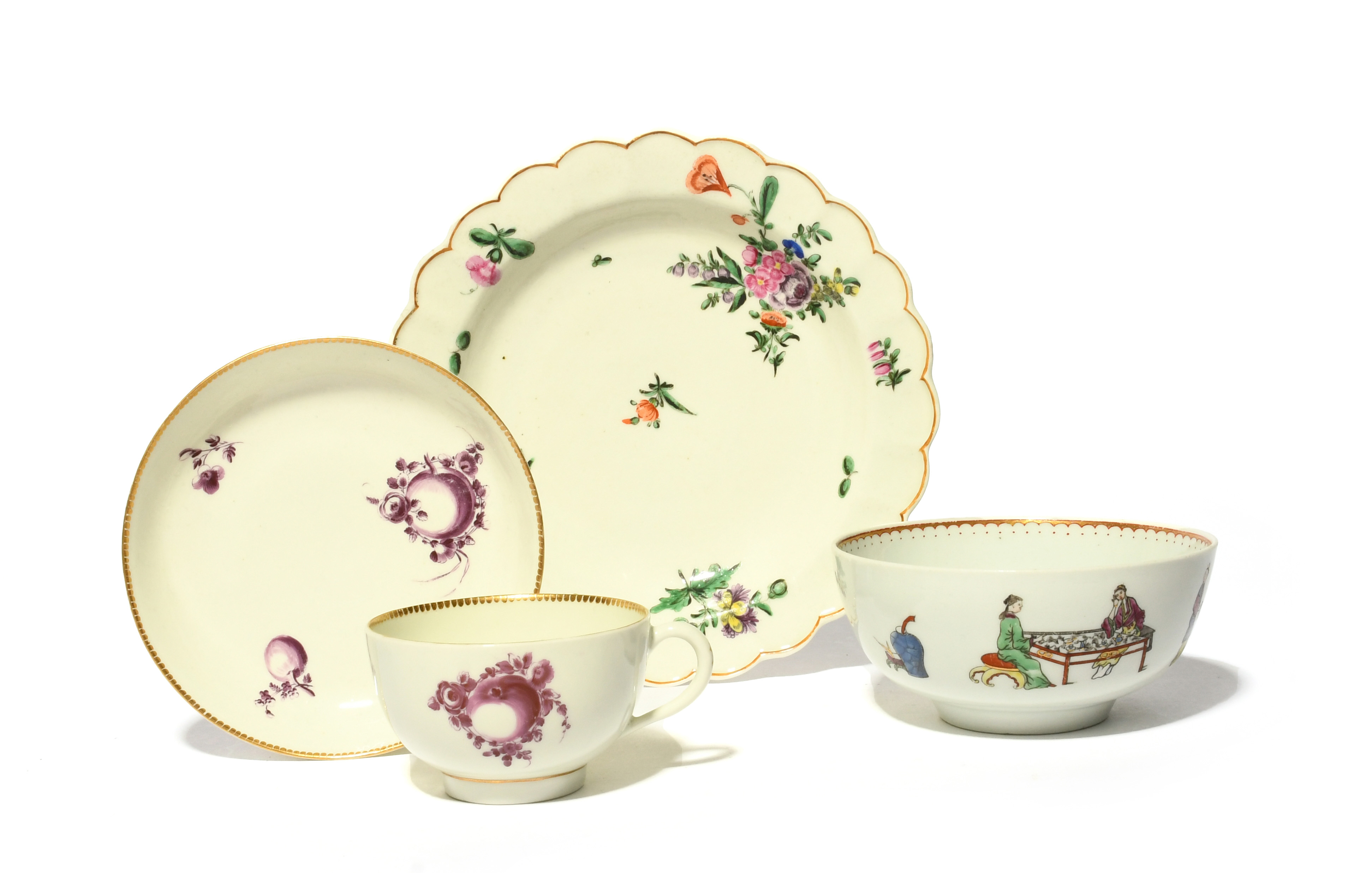 A small Worcester bowl, c.1765-70, printed and coloured with Chinese figures at various pursuits, a Worcester plate painted with sprays of flowers, and a teacup and saucer painted with fruit sprigs in puce monochrome, 19.3cm max. (4)