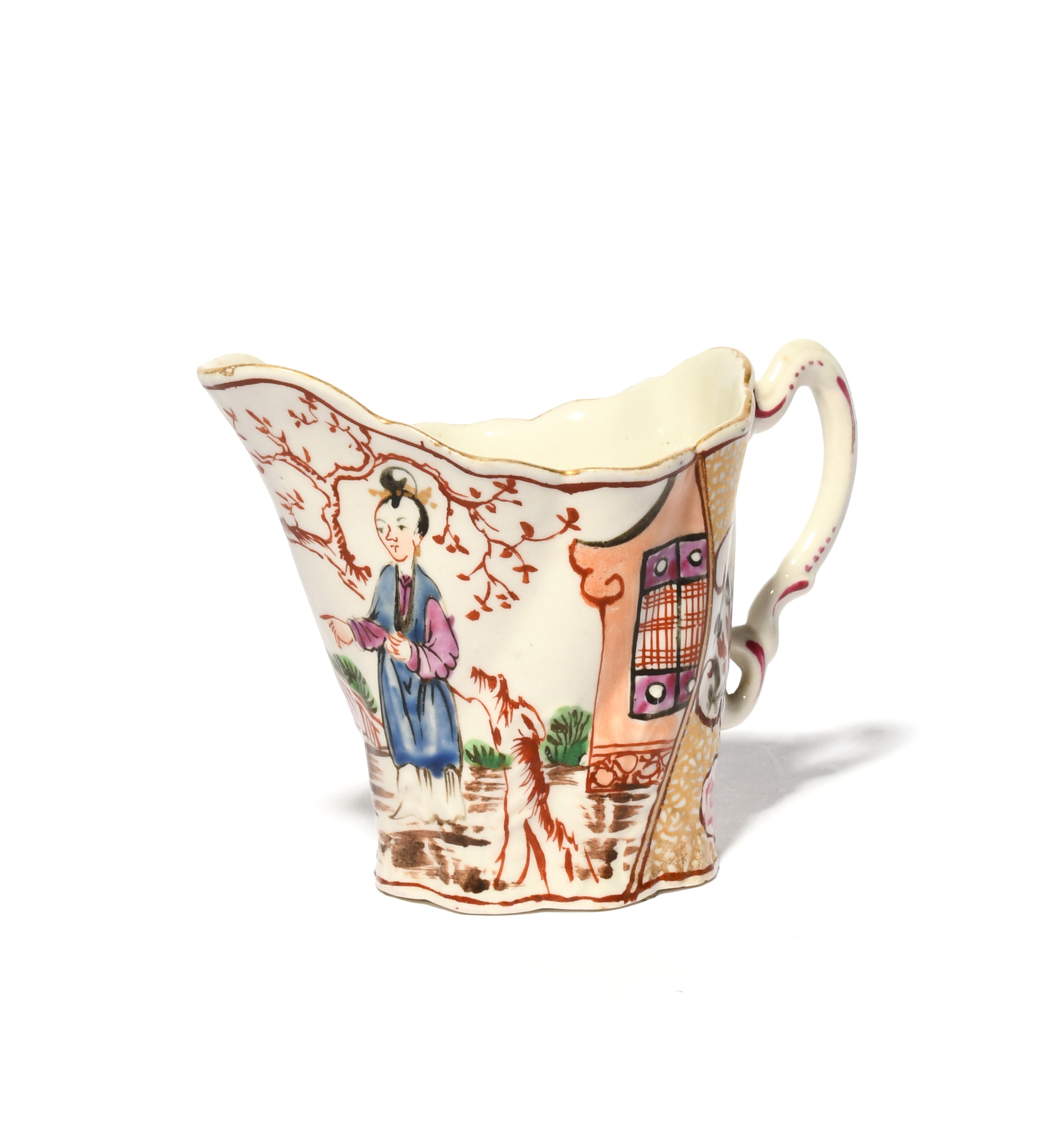 A Worcester 'Chelsea Ewer' shape milk or cream jug, c.1770-75, painted in the Mandarin manner with a