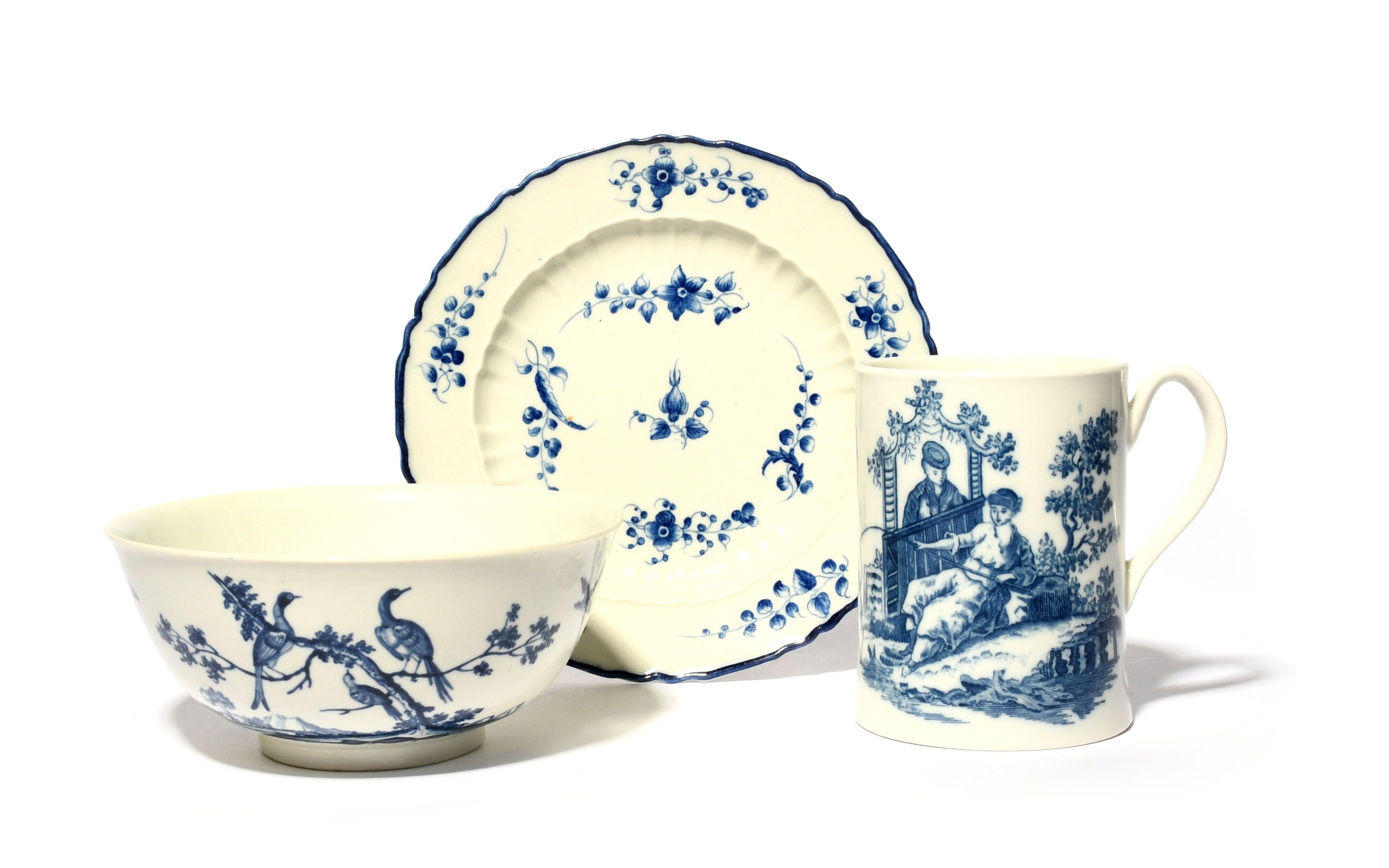 A Caughley blue and white mug, c1775-85, printed to one side with La PĂȘche design and La Promenade Chinoise to the other, C mark, a Worcester blue and white slop bowl painted with birds in branches and a small blue and white Worcester plate decorated with sprigs of flowers and foliage, 19.5cm max (3)
