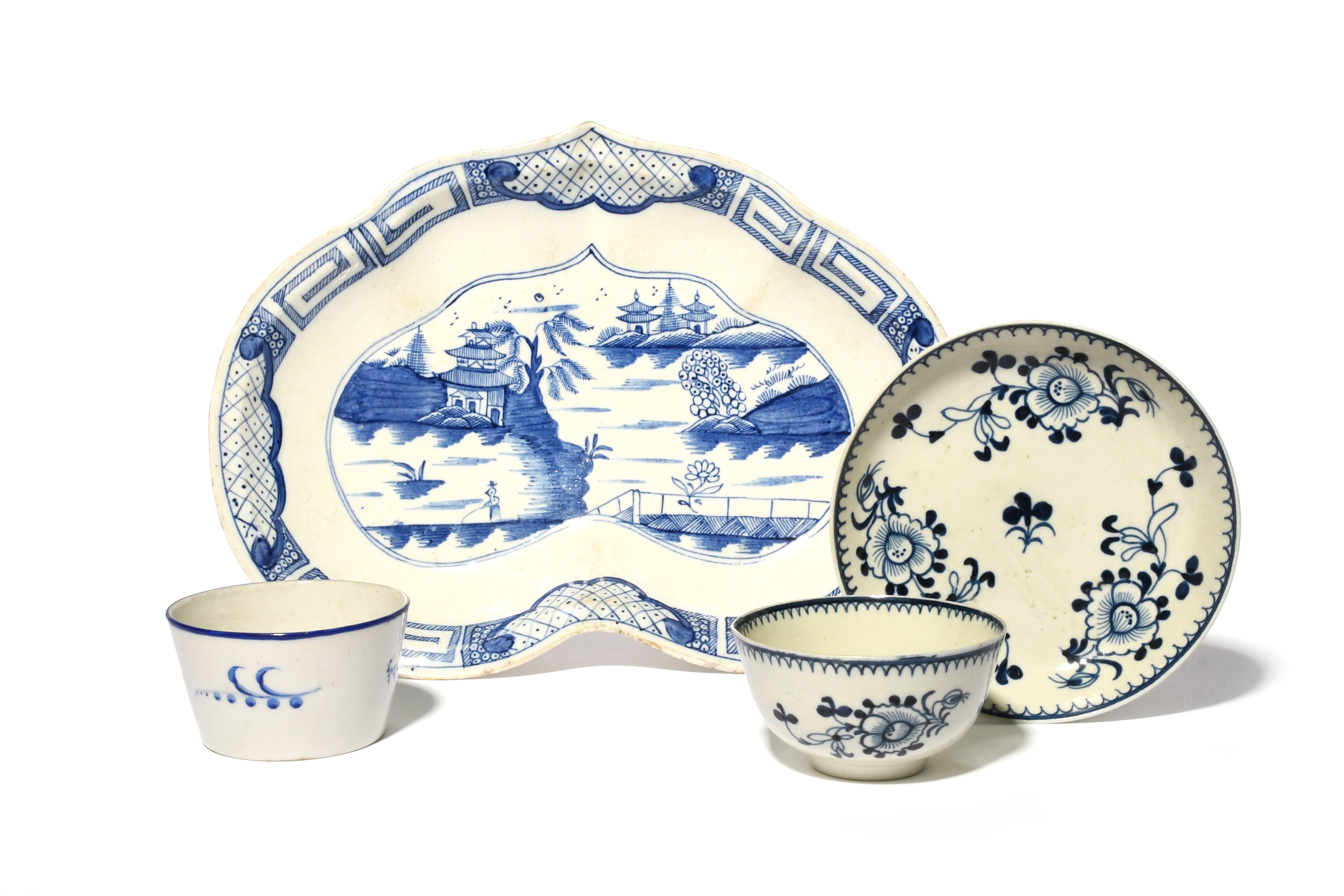 A Caughley blue and white dish, c.1785-93, painted with the Weir pattern in a bright blue within a panelled trellis and Greek key border, a Liverpool teabowl and saucer painted with flower sprays, and a Derby pan with lily of the valley sprigs in overglaze blue, 26.7cm max. (4)