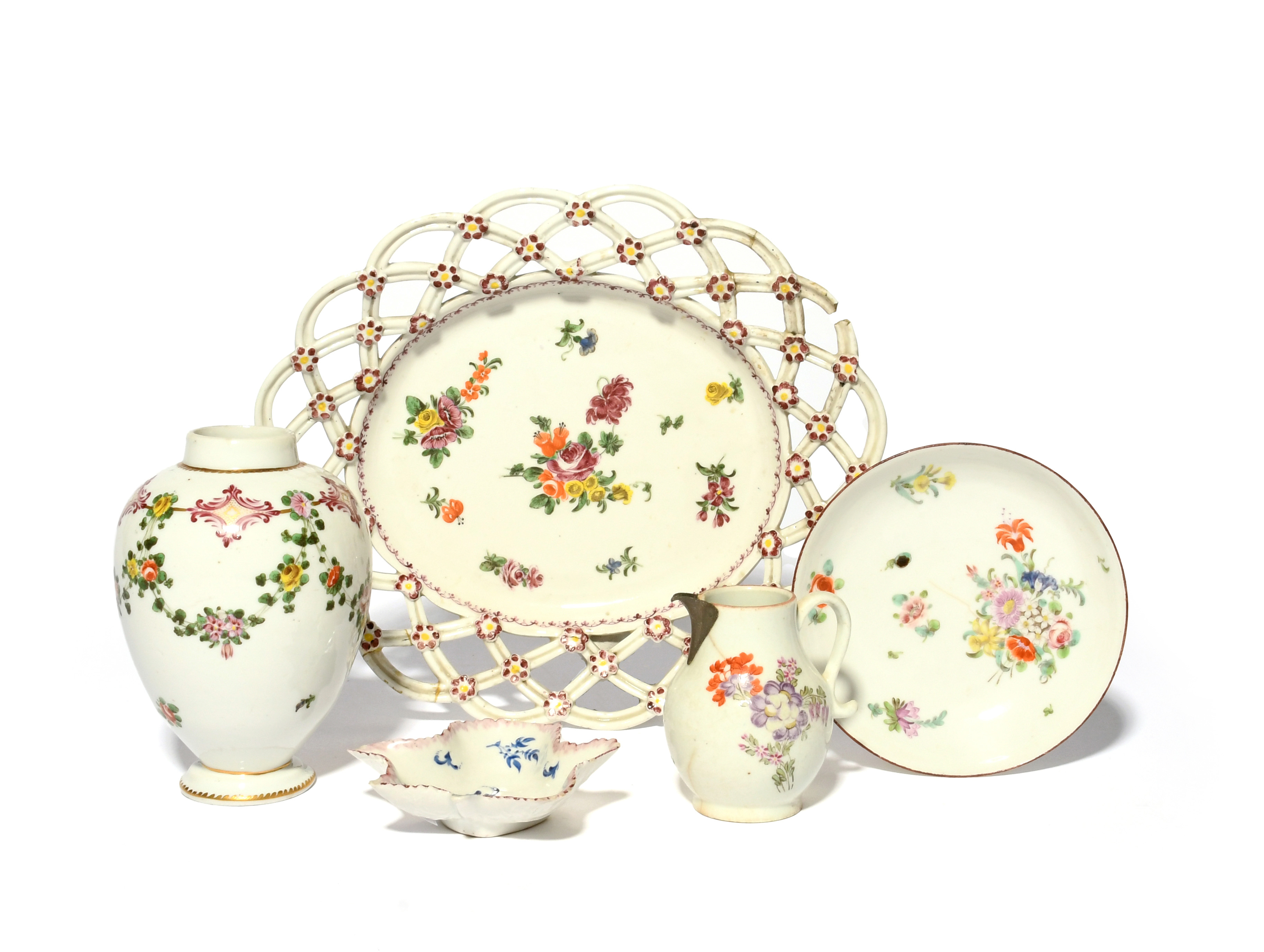 A group of Bristol porcelains, c.1772-75, including a tea canister of ovoid shape, painted with floral garlands, a basket stand with pierced rim applied with flowers, a pickle leaf dish with blue and puce sprigs, a saucer painted with polychrome flower sprays, and a Lowestoft milk jug, some damages, 25.3cm max. (5)