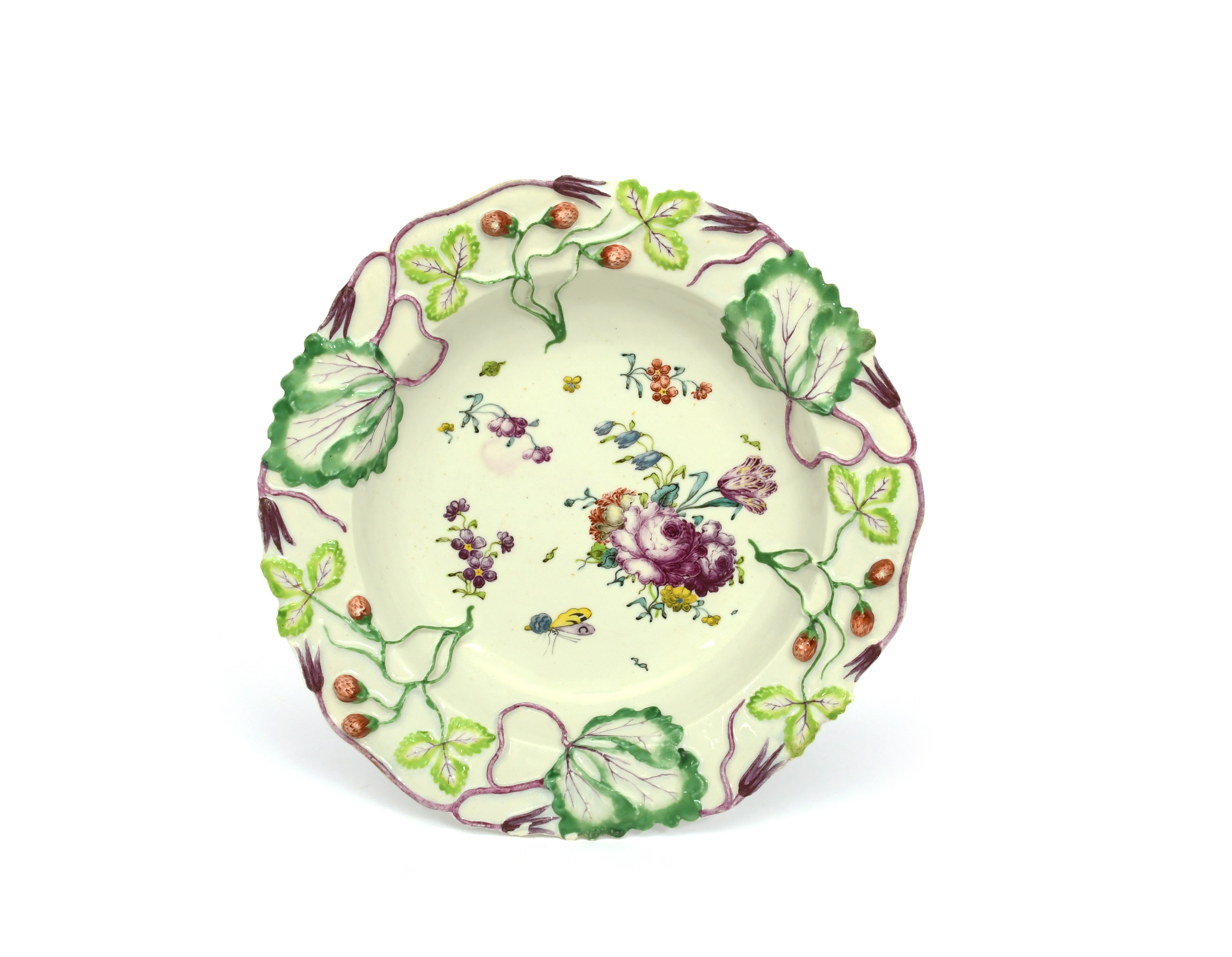 A Longton Hall strawberry soup plate or shallow bowl, c.1756, the rim moulded and painted with large strawberry leaves and small fruits, the well painted with sprays of flowers and a large insect, 23.7cm.
