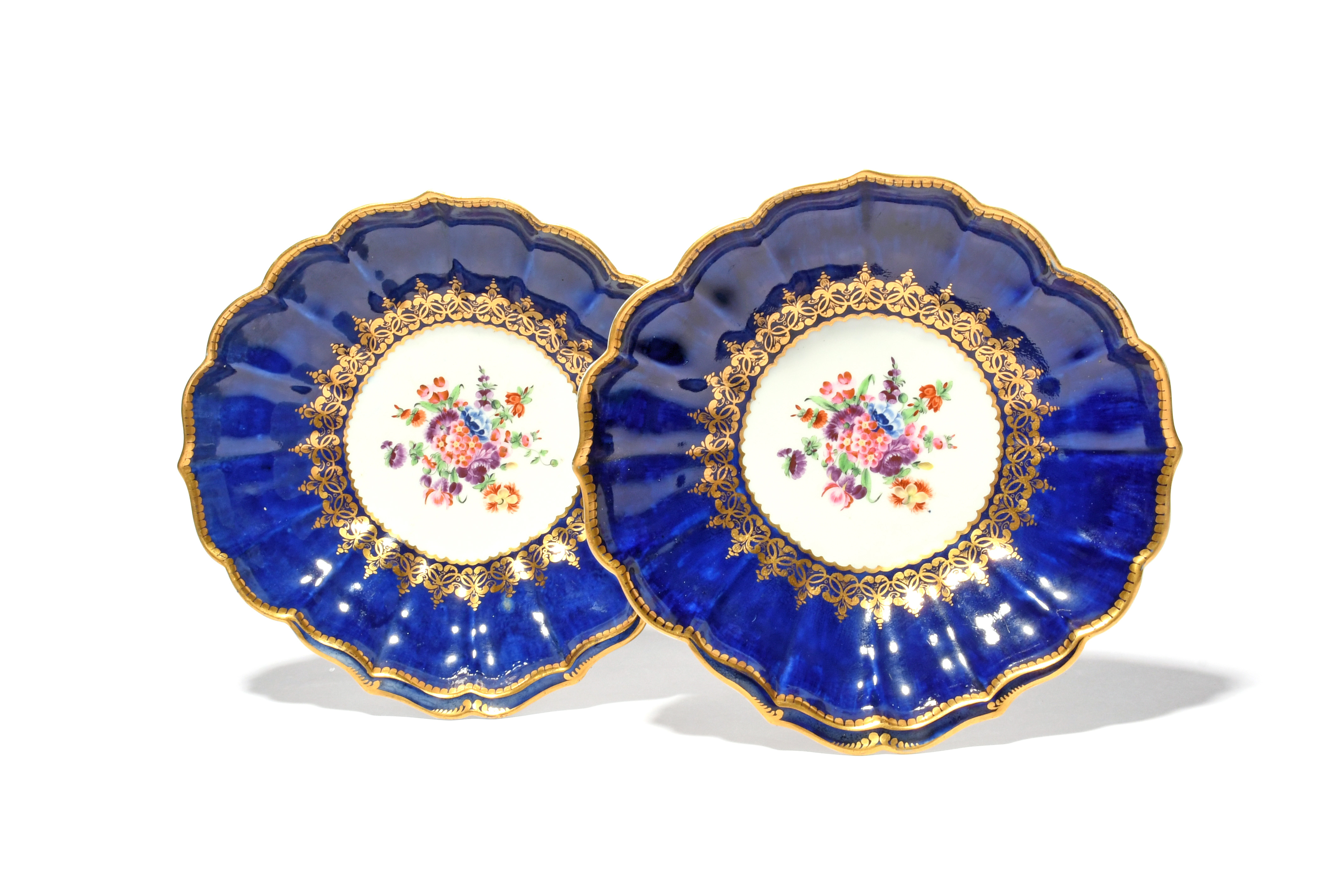 A pair of Worcester dessert plates, c.1770, of lobed shell shape, each painted with a central flower arrangement to the well, within a formal gilt scroll border reserved on a wet blue ground, blue crescent marks, 21cm. (2)