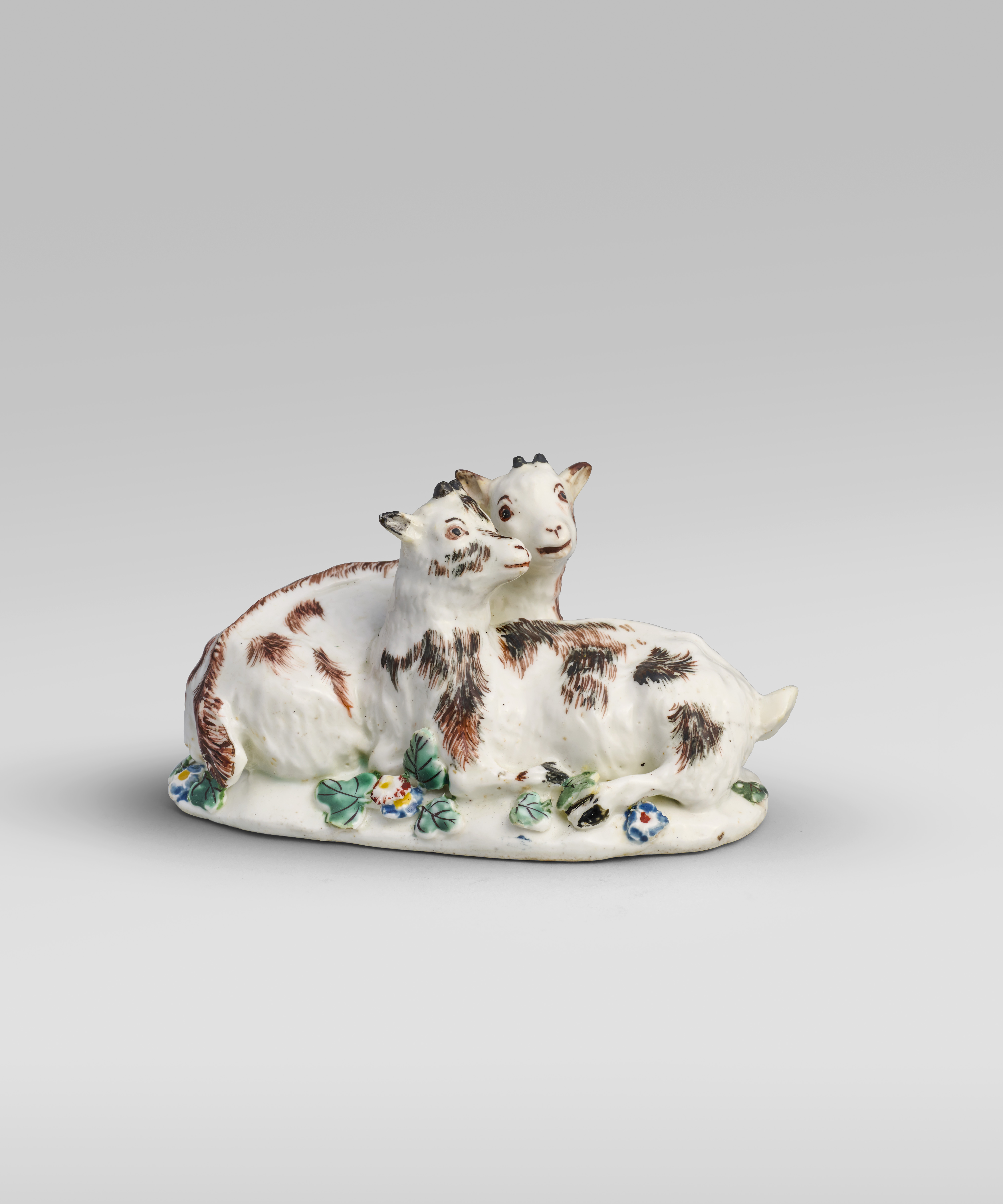 A rare Chelsea figure group of goats, c.1750-52, modelled with two kids recumbent on a low pad base