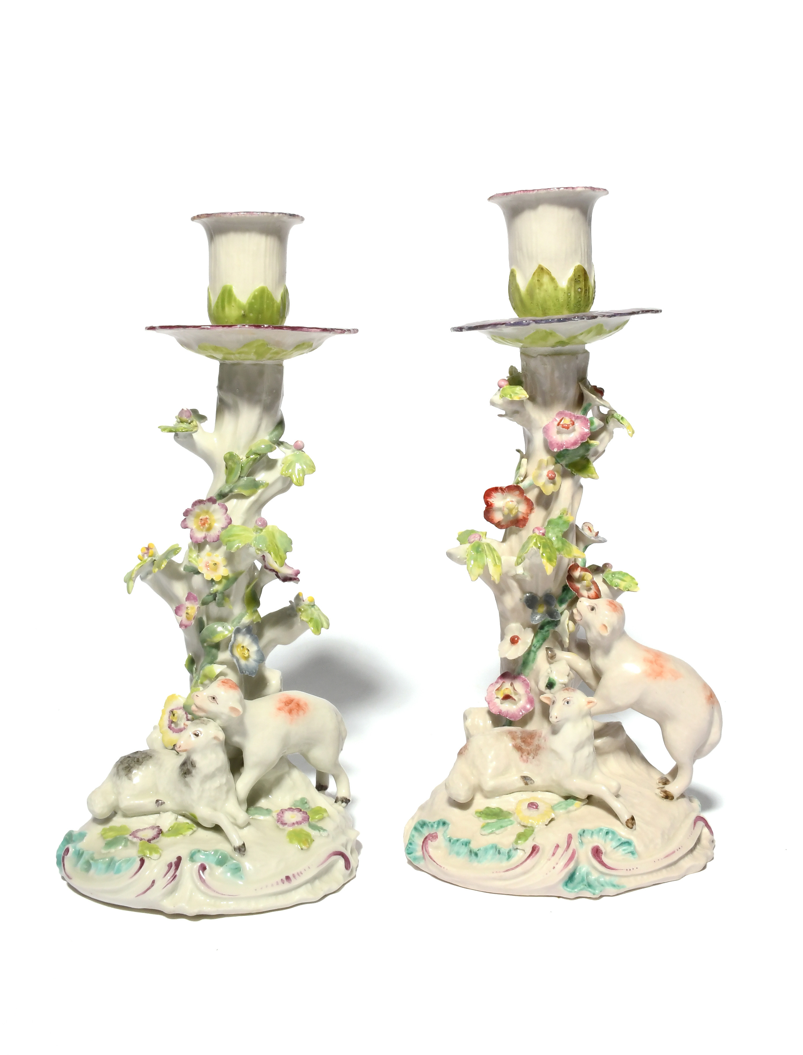 A matched pair of Derby figural candlesticks, c.1765, each modelled with two lambs at the foot of a tree stump entwined with flowers and leaves, rising to feather-edged sconces and drip pans, raised on low scrolled bases picked out in puce and turquoise, some good restoration, 21.5cm. (2)