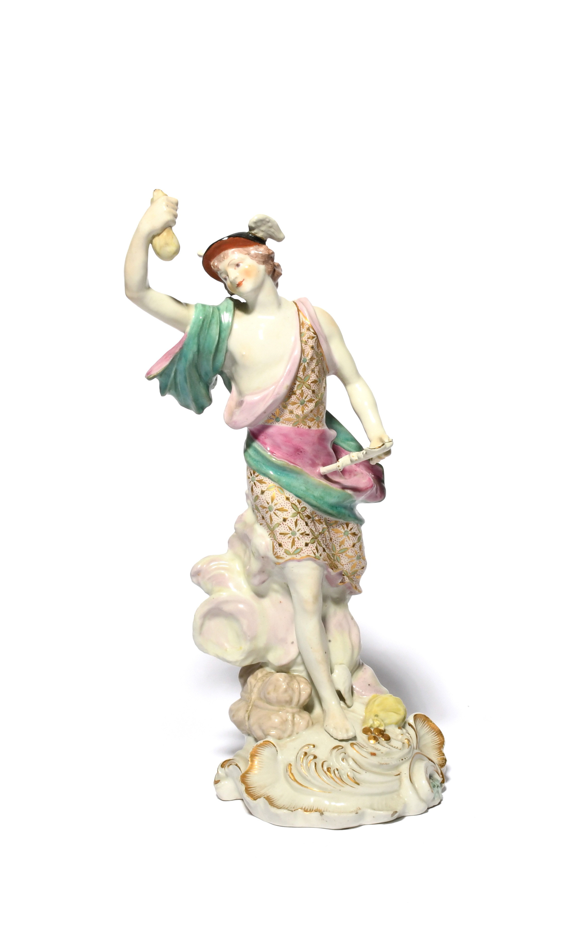 A large Derby figure of Mercury, c.1760-65, wearing a winged hat and holding a caduceus in his left hand, a small bag aloft in his right, raised on cloud scrolls with a further spilling bag of coins at his feet, good restoration, 33.8cm.