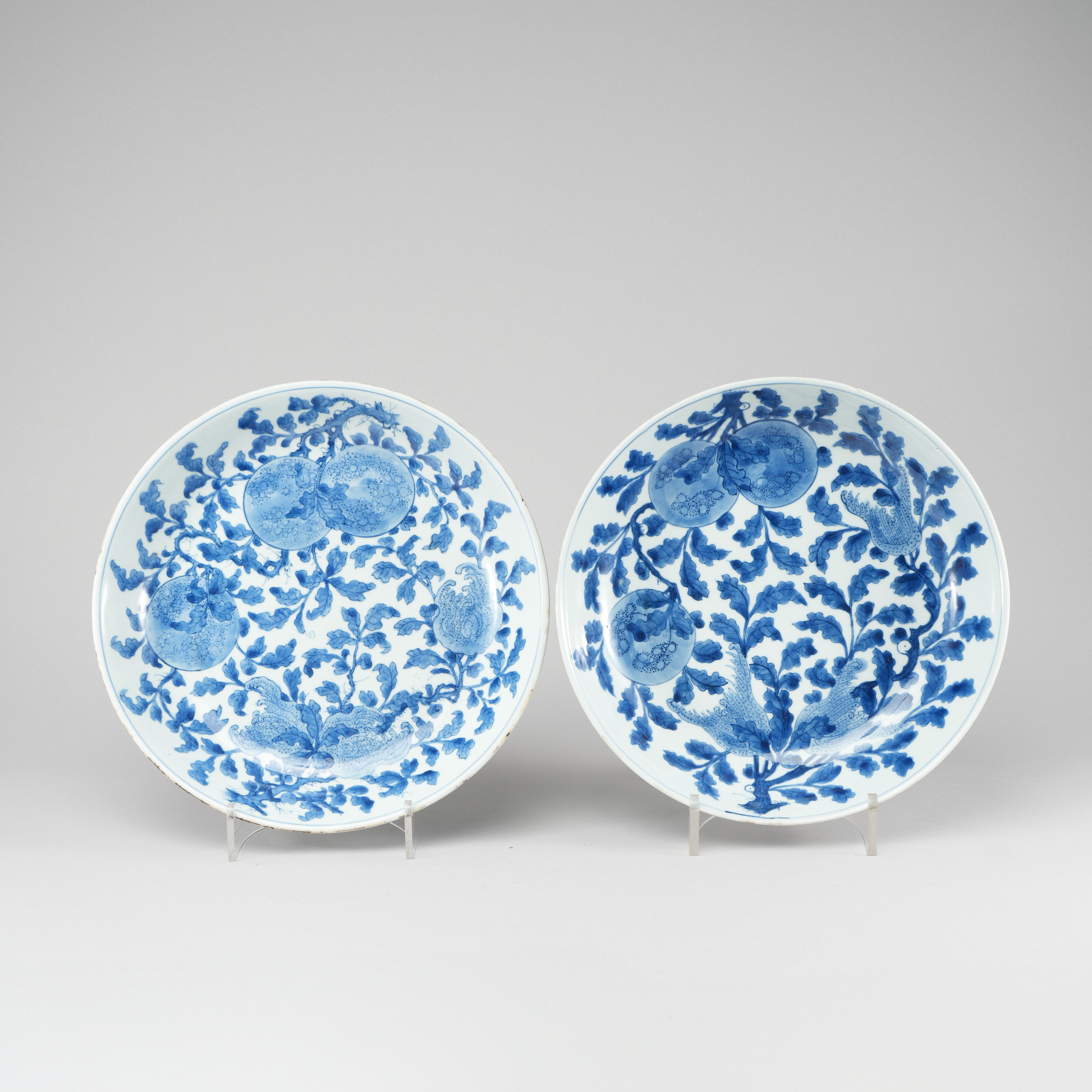 A NEAR PAIR OF CHINESE BLUE AND WHITE 'FINGER CITRON AND PERSIMMON' DISHES