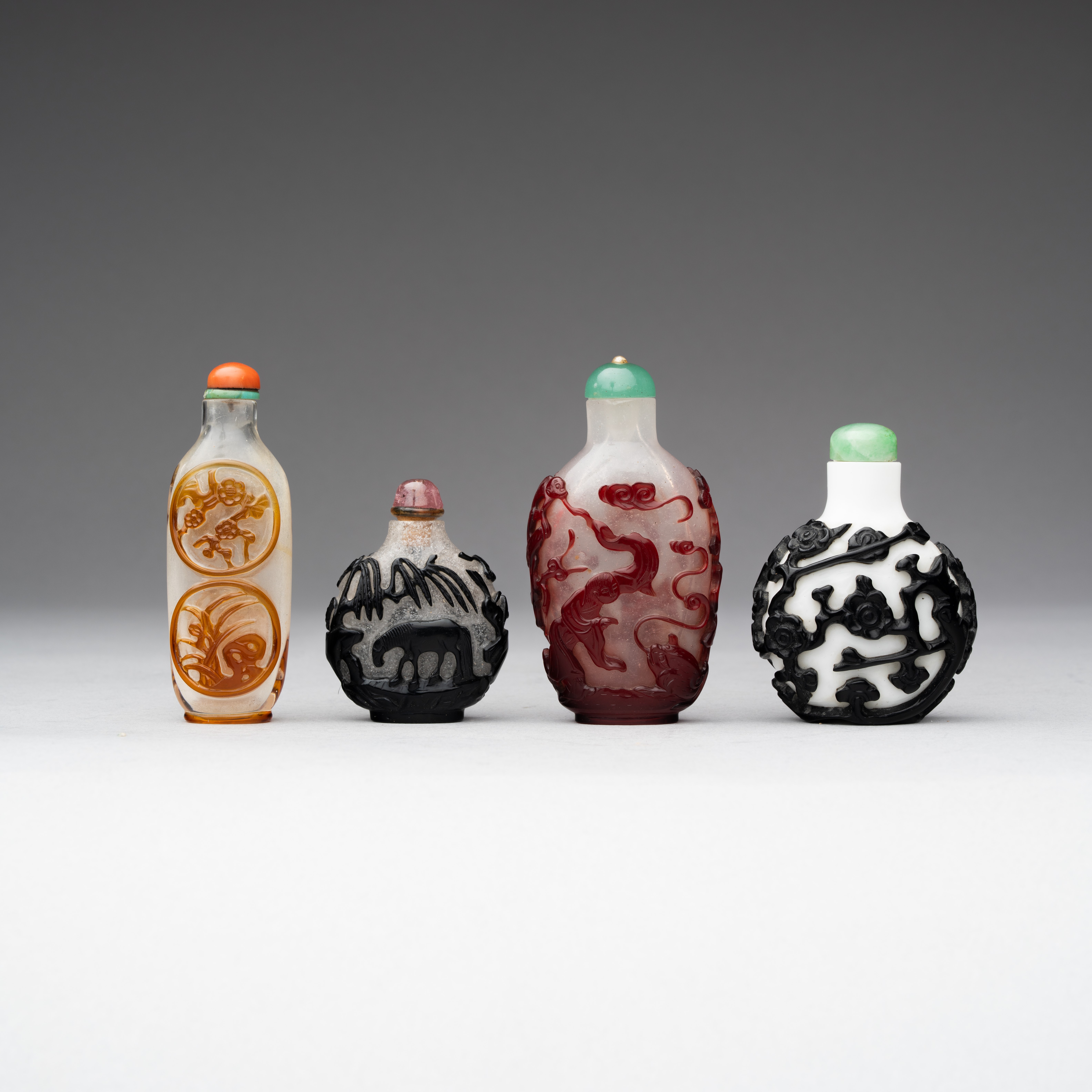 The smallest in translucent mottled glass with black overlay depicting two horses amongst trees; another in white glass with black overlay depicting prunus branches and flowers; the third in transparent glass with honey-coloured overlay depicting prunus, orchid, pine and bamboo; the fourth in milky glass with ruby red overlay depicting Liu Hai and his three-legged toad to one side, and Magu and a monkey holding peaches to the other.