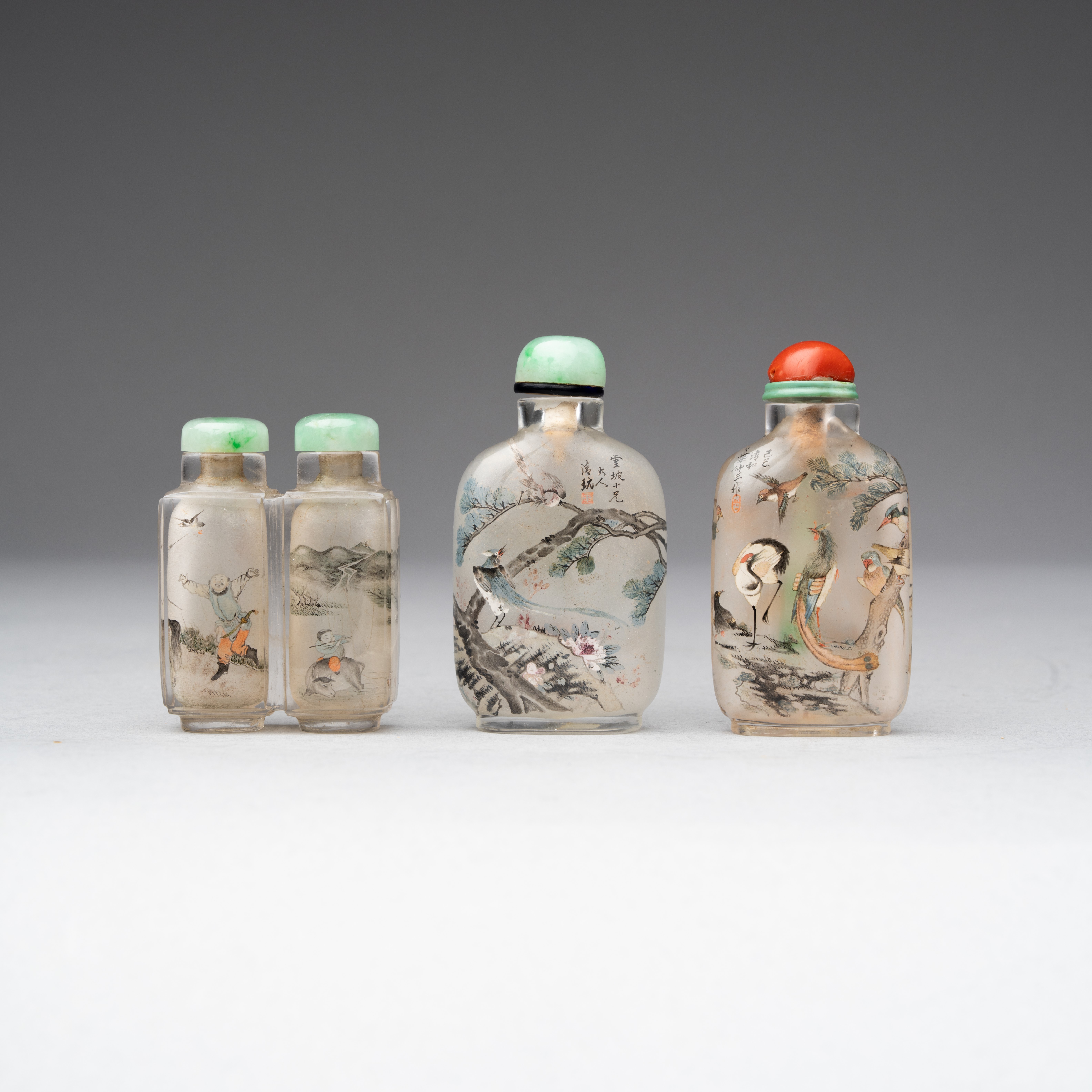 λ THREE CHINESE INTERIOR-PAINTED ROCK CRYSTAL AND GLASS SNUFF BOTTLES