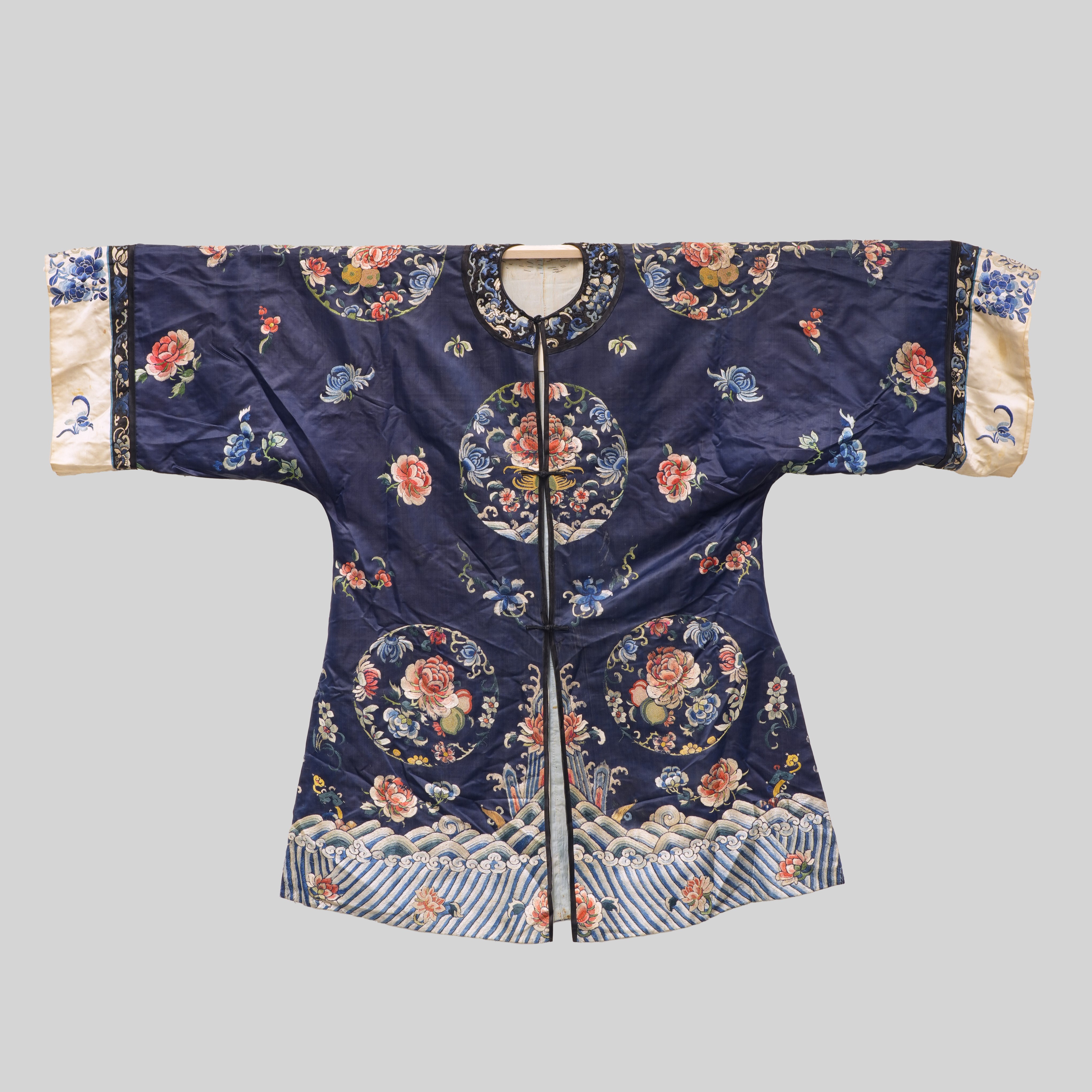 A CHINESE MIDNIGHT-BLUE EMBROIDERED SILK SURCOAT