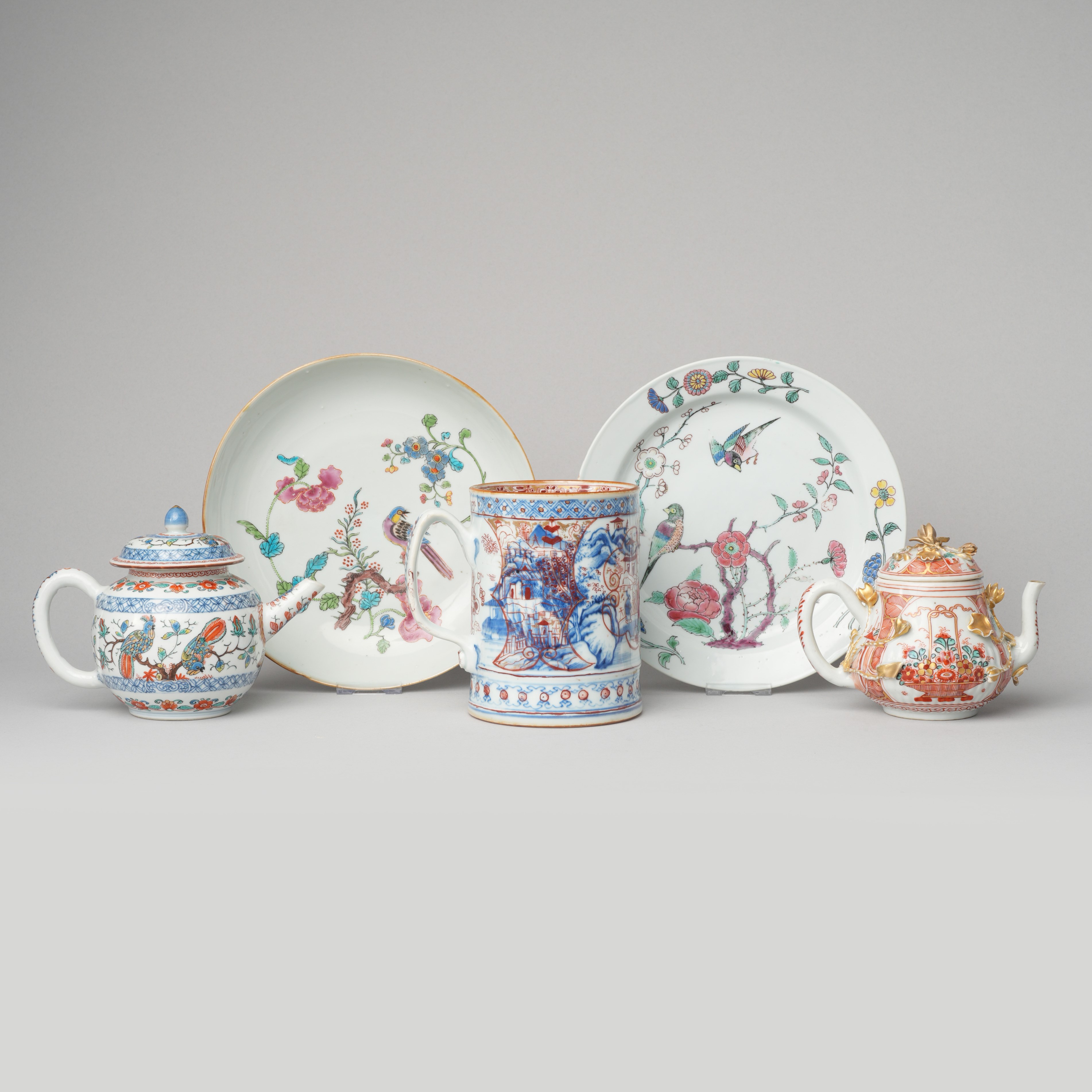 Published: H Espir, European Decoration on Oriental Porcelain, p.67, pl.24 for one of the teapot; p.107, pl.41 for one of the plates.