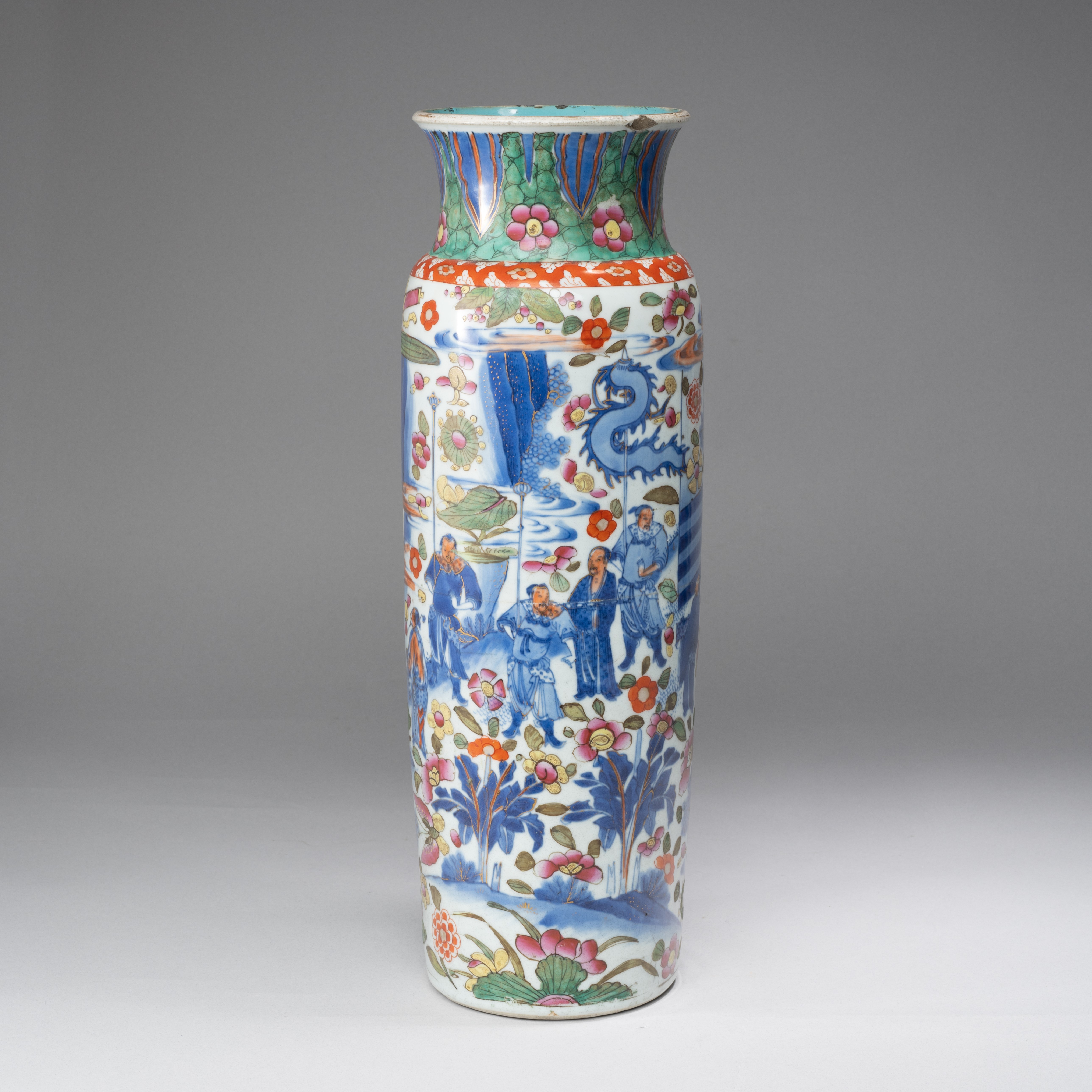 A CHINESE BLUE AND WHITE LATER-ENAMELLED 'FIGURAL' SLEEVE VASE