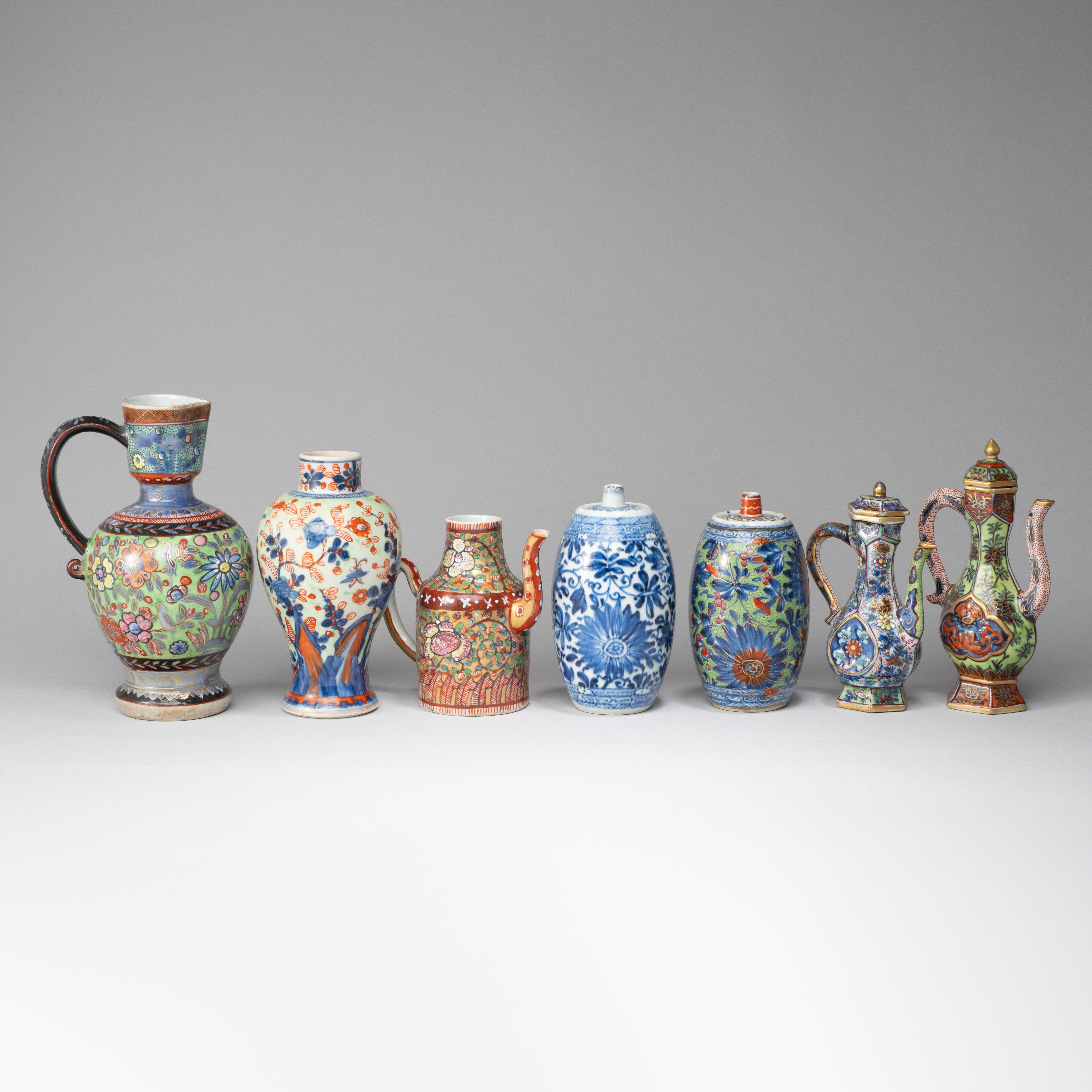 Comprising: two barrel-shaped sprinklers; two small hexagonal ewers with covers; a baluster vase; a ewer with a cylindrical body; and a Japanese Arita ewer; variously decorated with underglaze blue, later-added European enamels and gilding. Three with a paper label for 'Helen Espir Collection'; two of which with paper labels reading 'HMEC 302' and 'HMEC 386'.