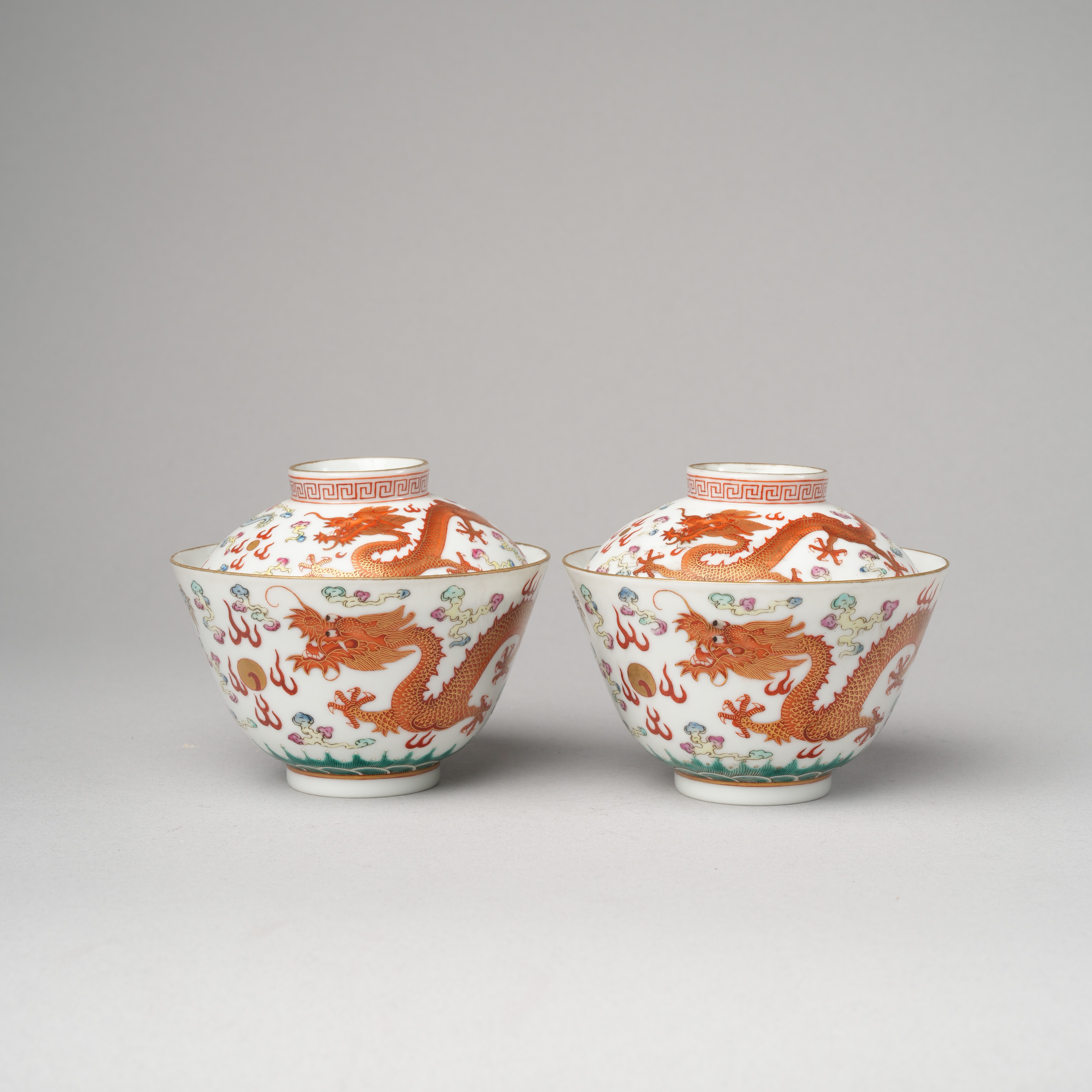 A PAIR OF CHINESE FAMILLE ROSE 'DRAGON' CUPS AND COVERS
