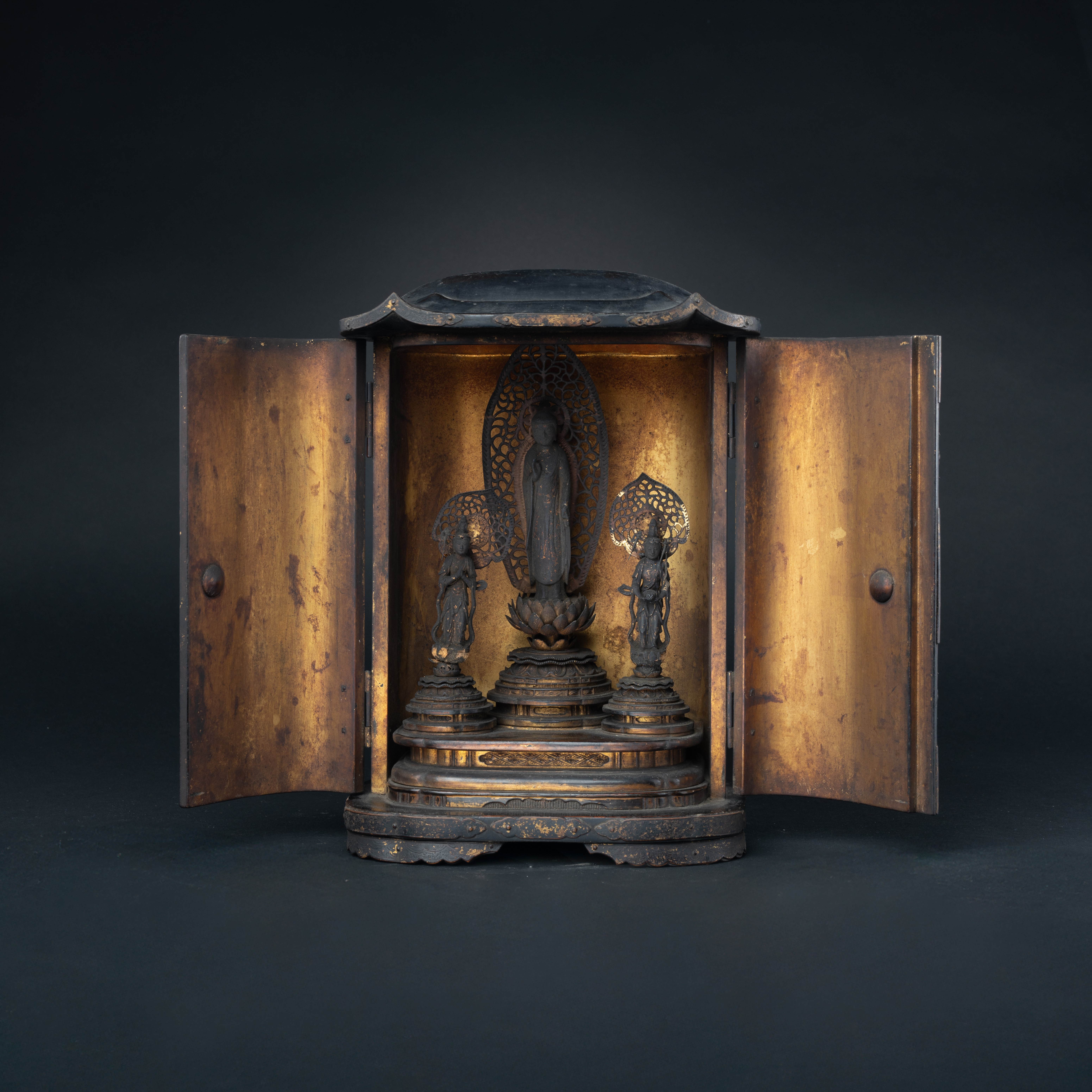 The case lacquered black with a domed top and four bracket feet, the metal fittings decorated with scrolling foliate motifs; the doors opening to reveal the Amida Triad comprising of Amida Buddha, Kannon Bosatsu and Seishi Bosatsu, each raised on lotus pedestals and framed by a stylised nimbus, the interior gilded, 28.5cm x 21cm x 14.5cm.