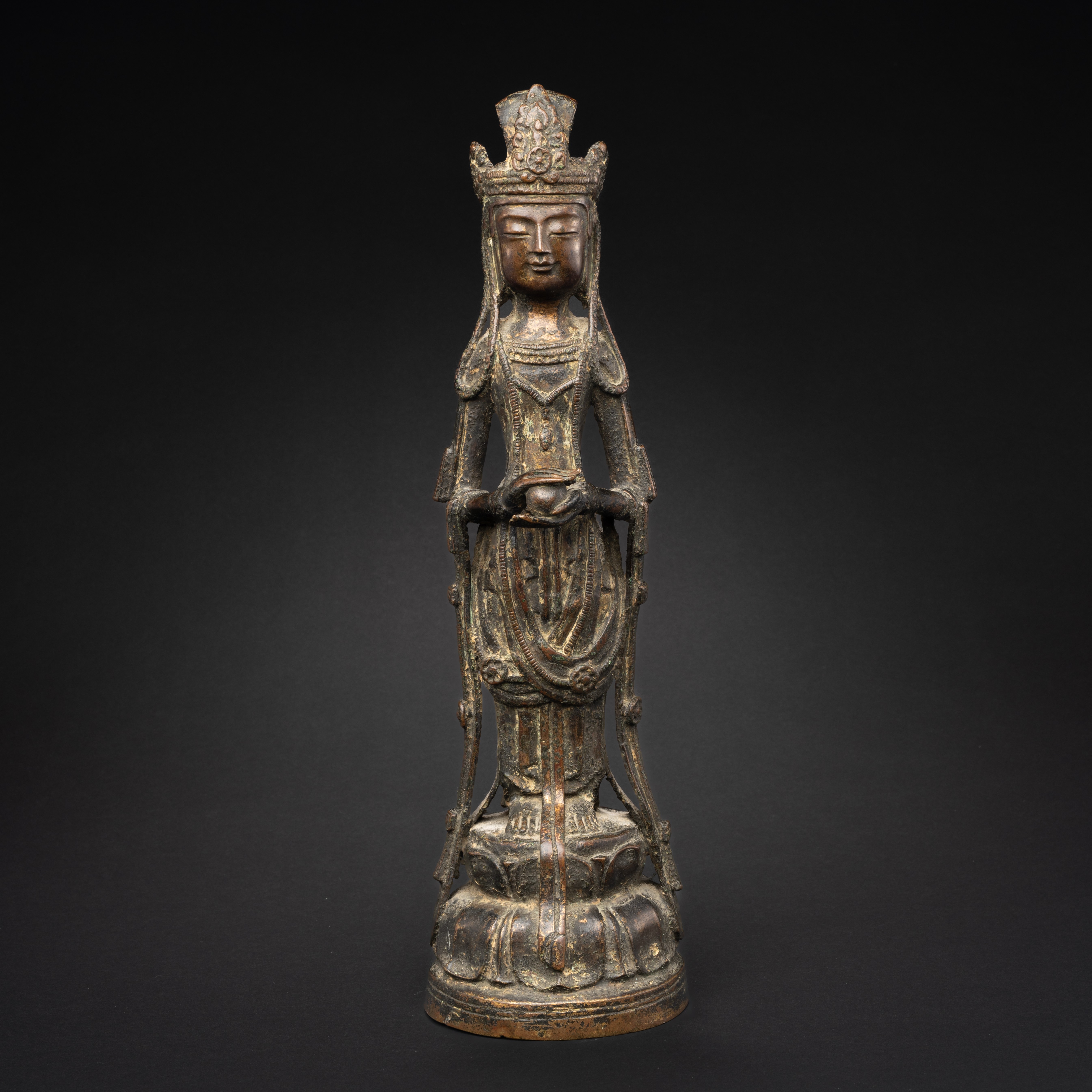 The Bodhisattva of Mercy is depicted standing on a double-lotus throne, holding a jewel in her hands; she wears a tenne draped over her forearms and beaded jewellery; her headdress features the image of Amida Nyorai; 37.8cm.