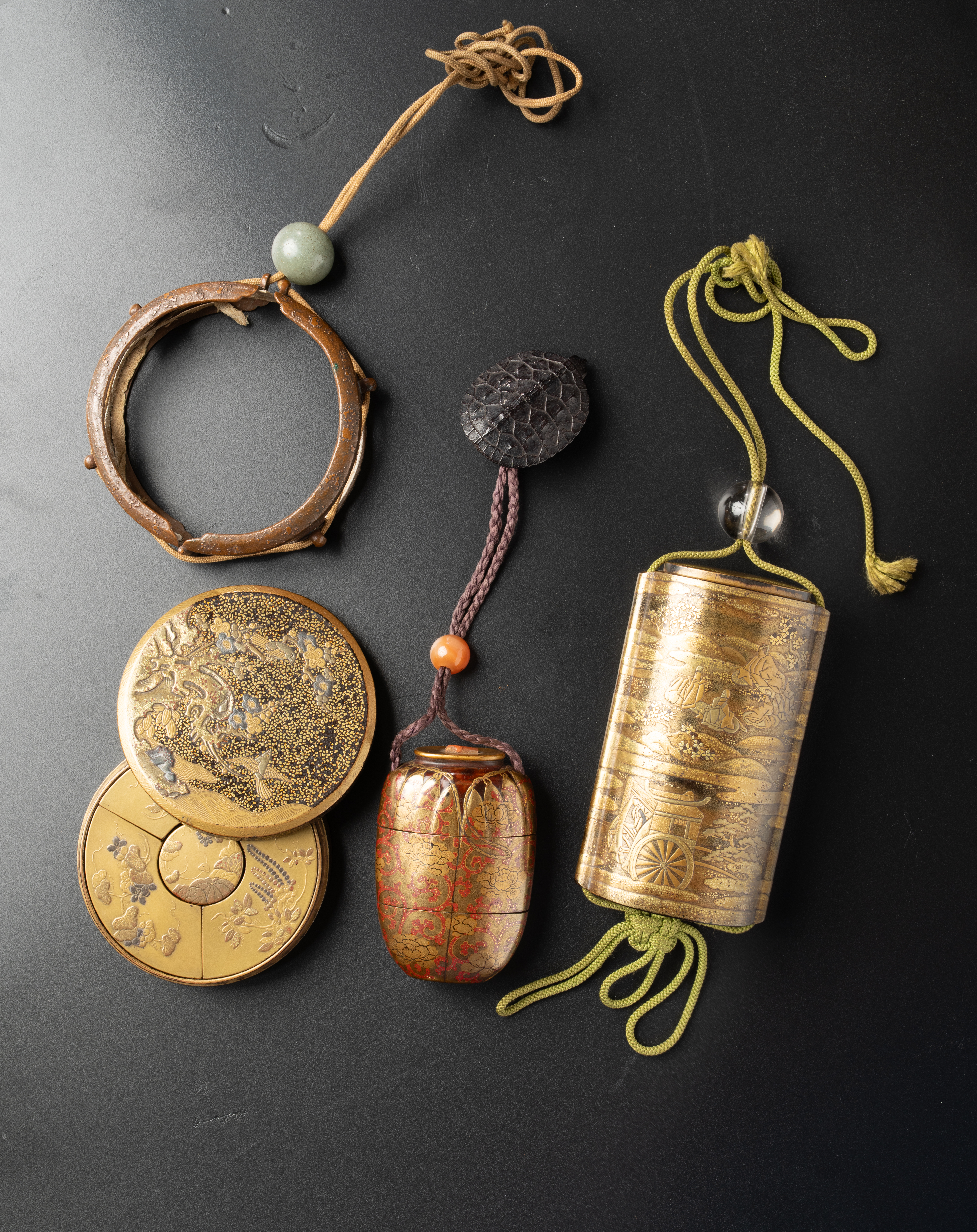 Including a saya (sheath) inro, the outer casing decorated with many figures at leisure in a garden wearing Heian-style garments, probably a scene from the Genji Monogatari (Tale of Genji); one side with a goshoguruma (ox-drawn carriage) with travellers visible inside, all rendered in gold hiramaki-e, nashiji and kirikane, the five-case inro inside in gold maki-e and the inside in nashiji; another piece a two-case inro, simulating a kinchaku (drawstring bag) encasing a pottery chaire (tea caddy and lid) with a fake lacquer lid topped with a branch of coral, the mock fabric decorated with large flowerheads and scrolling tendrils, with an agate ojime and a wood netsuke carved as a turtle with amber eyes; the last item a circular kobako box decorated with birds, flowers and rocks, containing four smaller boxes embellished with further blossoms and scrolling tendrils, all rendered in gold and silver himaraki-e and kirikane; the box encased in a metal hinged frame for use as a sagemono, together with a silk pouch, 9.8cm max. (12)