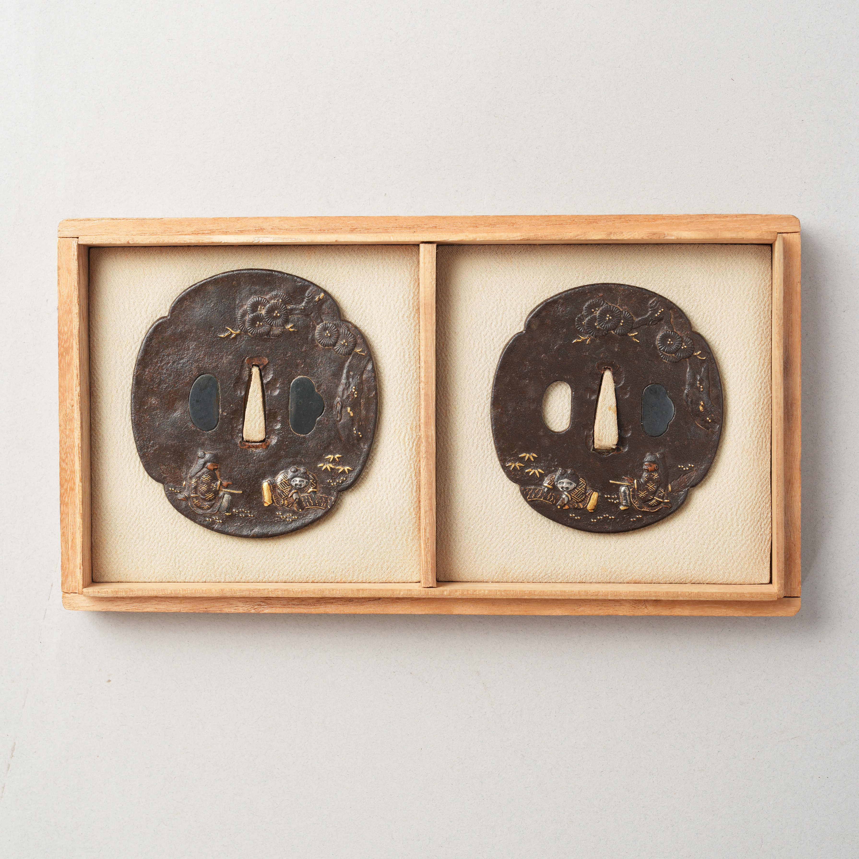 Both in iron inlaid with gold, silver and shakudo; decorated with mirror images of the two semi-legendary zen eccentrics Kanzan and Jittoku reading a handscroll, with pine above them; the reverse of each tsuba with a waterfall and mountains beyond; in an associated kiri box; with a Kanteisho certificate by the Nihon Token Hozon Kai (NTHK) describing a large and small (daishō) set of tsuba, mumei (unsigned), attributed to the Nara School, mid-Edo period; of shiho mokkogata shape (four corners rounded and squared off); certified Shoshin (genuine), issued by the NTHK president Miyano Teiji, on 16th July, Heisei 18 (2006); with the three seals of the committee judge members Miyano, Yamasaki, and Ohashi.