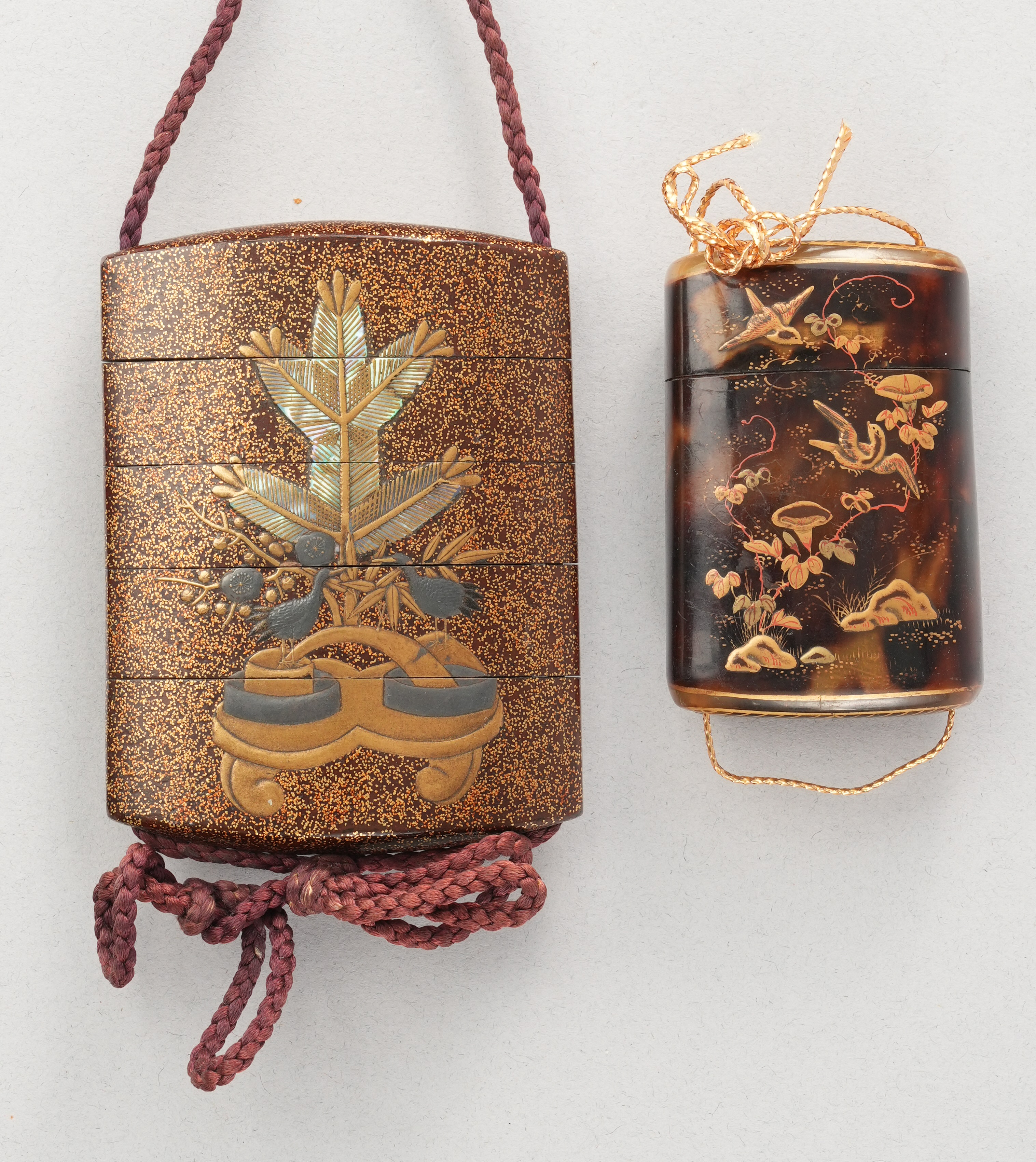 The four-case inro decorated in gold takamaki-e and nashiji with mother of pearl inlays; one side with two models of cranes, a branch of pine, bamboo and flowering prunus, the reverse with a wrapped fish on a kagetsudai (lacquer stand), possibly shogatsu kazari offerings to celebrate the New Year; the vesta case in tortoiseshell decorated with birds amongst foliage, 7cm.