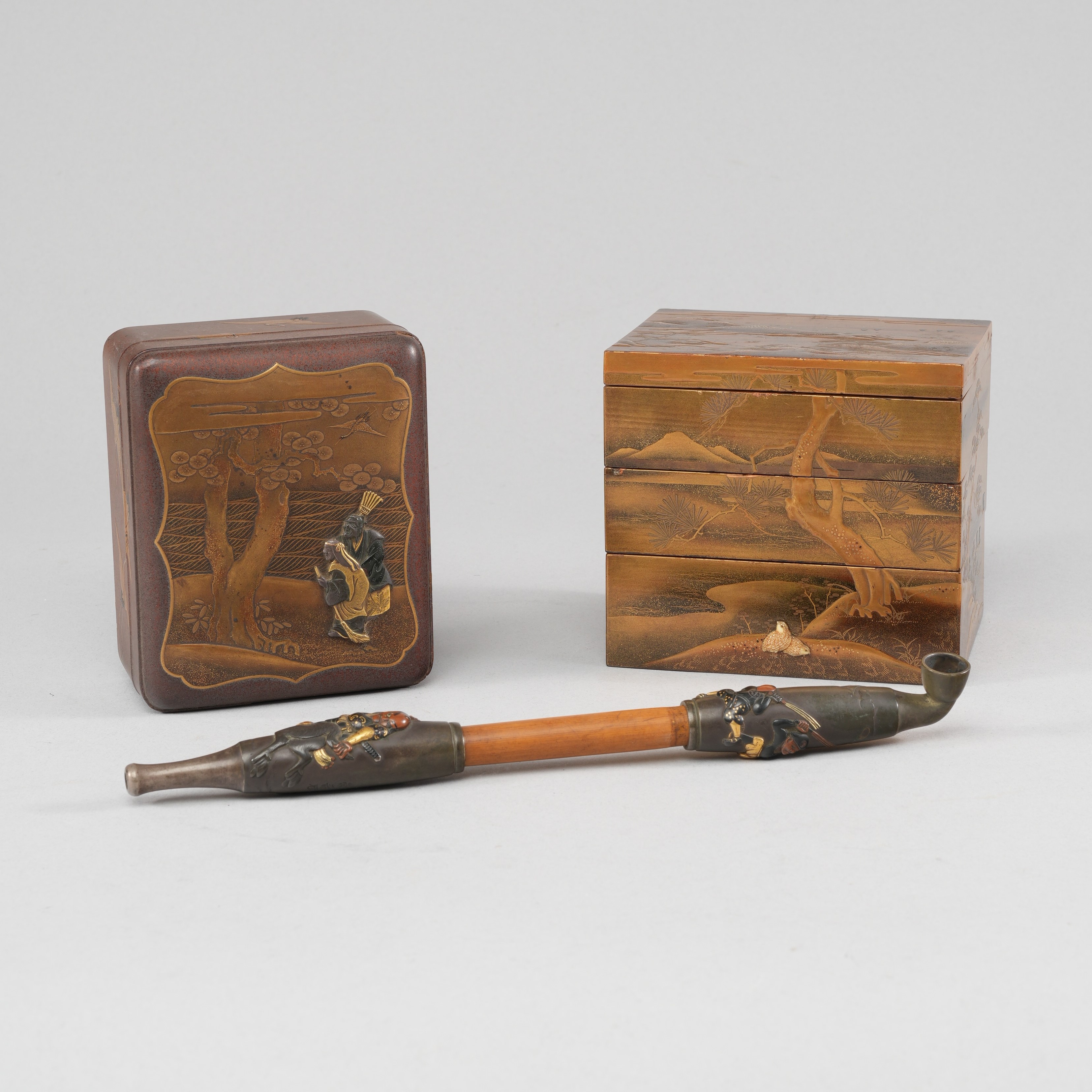 λ TWO JAPANESE LACQUER BOXES AND A PIPE