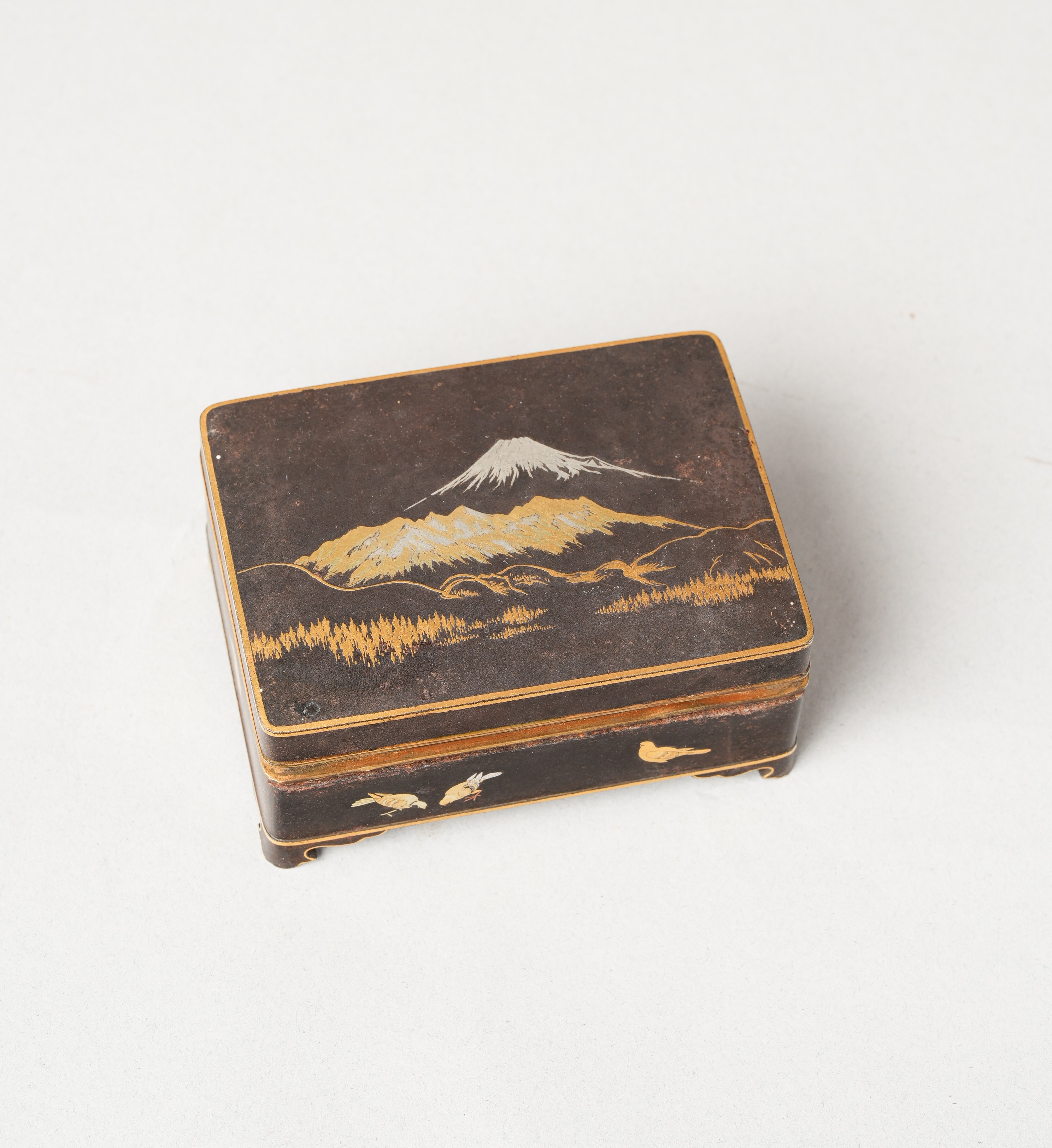 Of rectangular form and raised on four scrolling feet; the lid decorated with Mount Fuji towering above wooded hills, the sides with pecking doves; the interior with further birds and with a view of a thatched watermill, signed Shoryusai Ippu with kao underneath.