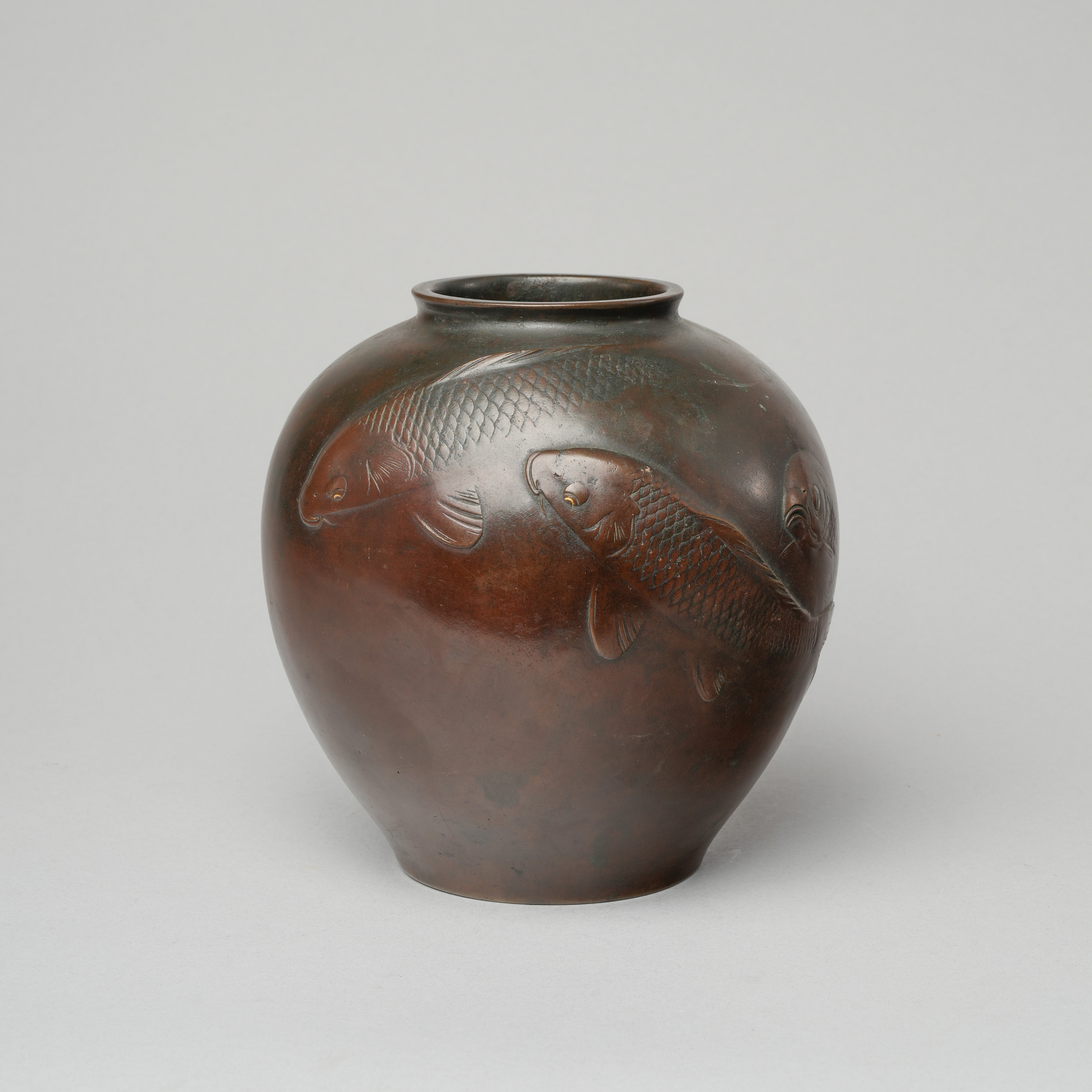 The carps are depicted swimming, their pupils picked out in gilt; the base with three stamped marks, possibly for Harada Houn (1898-1973).
