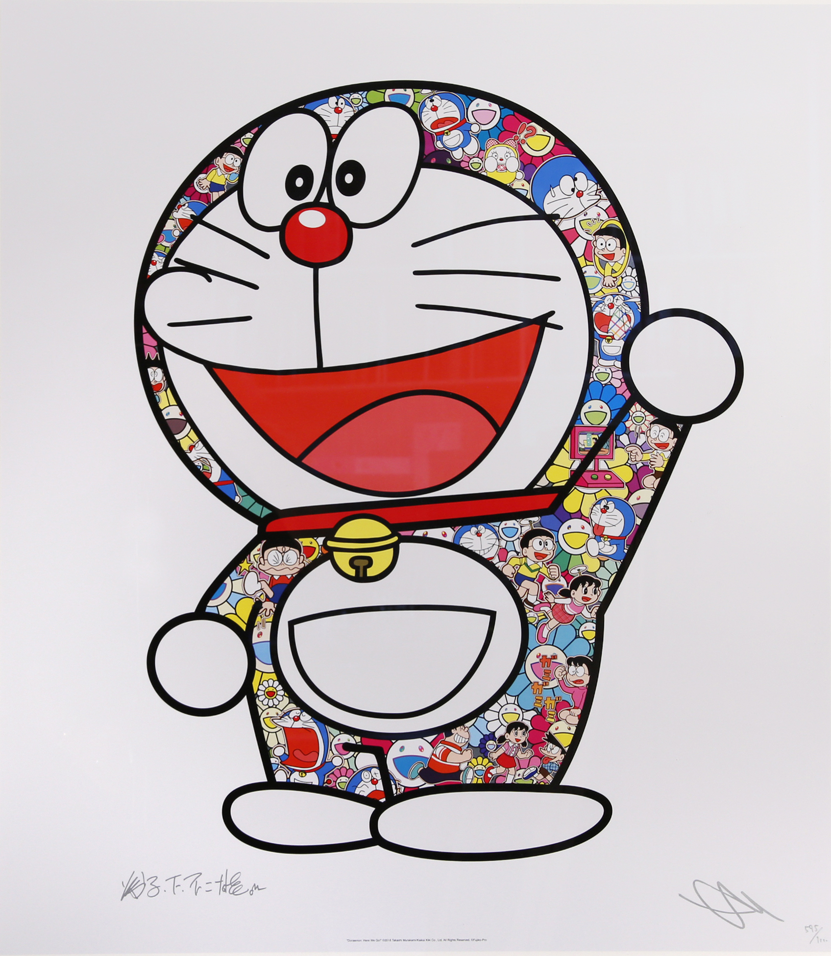 Two limited edition offset lithographs printed in colour on wove paper, entitled 'Doraemon, Here We Go' and 'Doraemon in the Field of Flowers'; the prints depict Doraemon from the front and back. Both are signed Murakami in silver ink; published by Kaikai Kiki Co., Ltd., Tokyo.