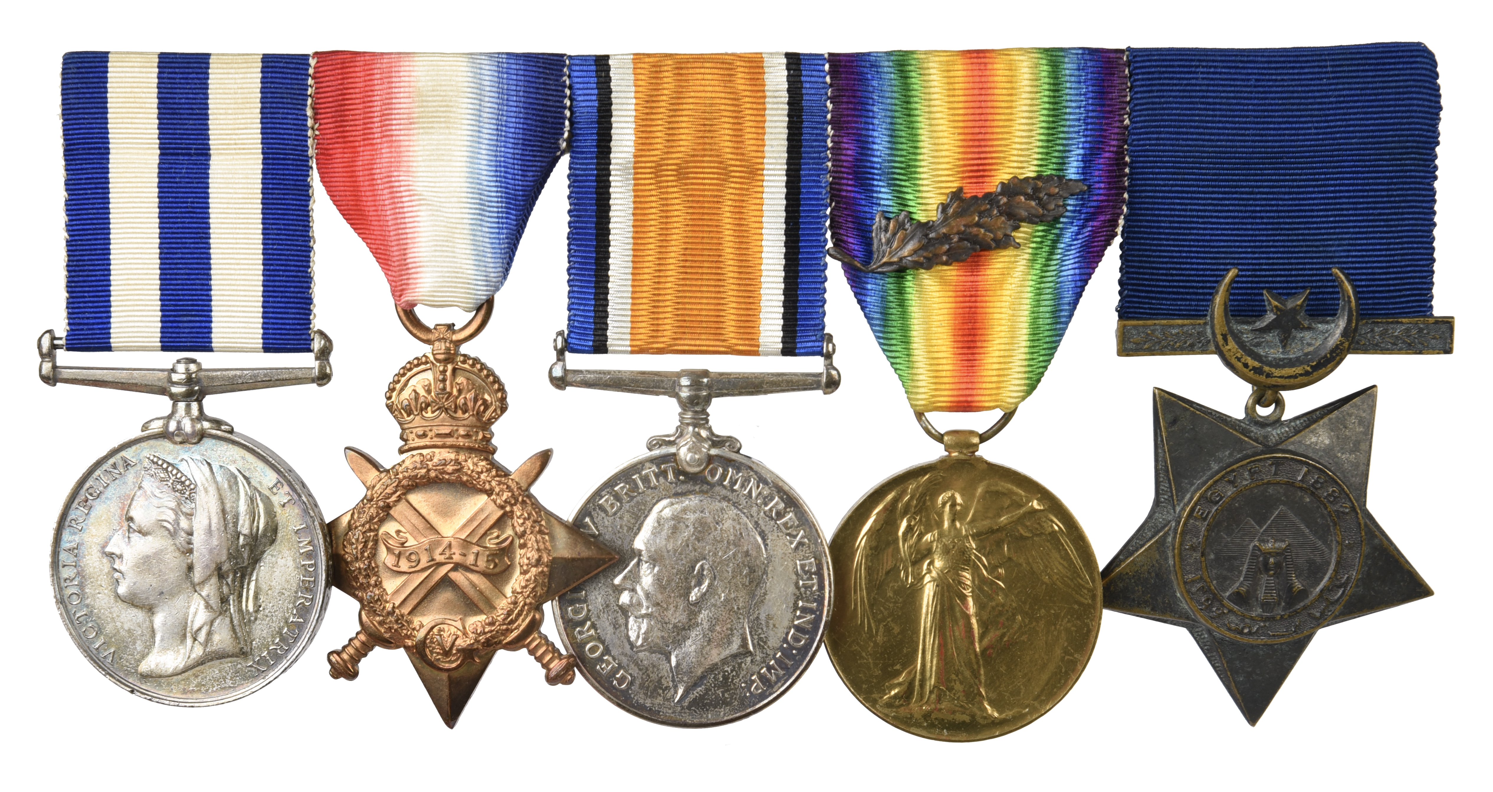 A group of five medals to Paymaster Commander Scarlett de Verde Taylor, Royal Navy: Egypt and Sudan Medal 1882-89, dated reverse, no clasp (S DE V. TAYLOR. CLERK. R.N. H.M.S. EURYALUS), engraved; 1914-15 Star (FT. PAYR. S. DE V. TAYLOR. R.N.); British War Medal 1914-20 (PAYR. COMMR. S. DE V. TAYLOR. R.N.); Victory Medal, MID emblem to the ribbon (PAYR. COMMR S. DE V. TAYLOR. R.N.); Khedive's Star, 1882 obverse; mounted for wearing, Egypt Medal with contact marks from the Khedive's Star, otherwise very fine, Great War trio good very fine, Khedive's Star very fine. [5]; together with a mounted set of corresponding dress miniature medals, all in a tailor's case.
