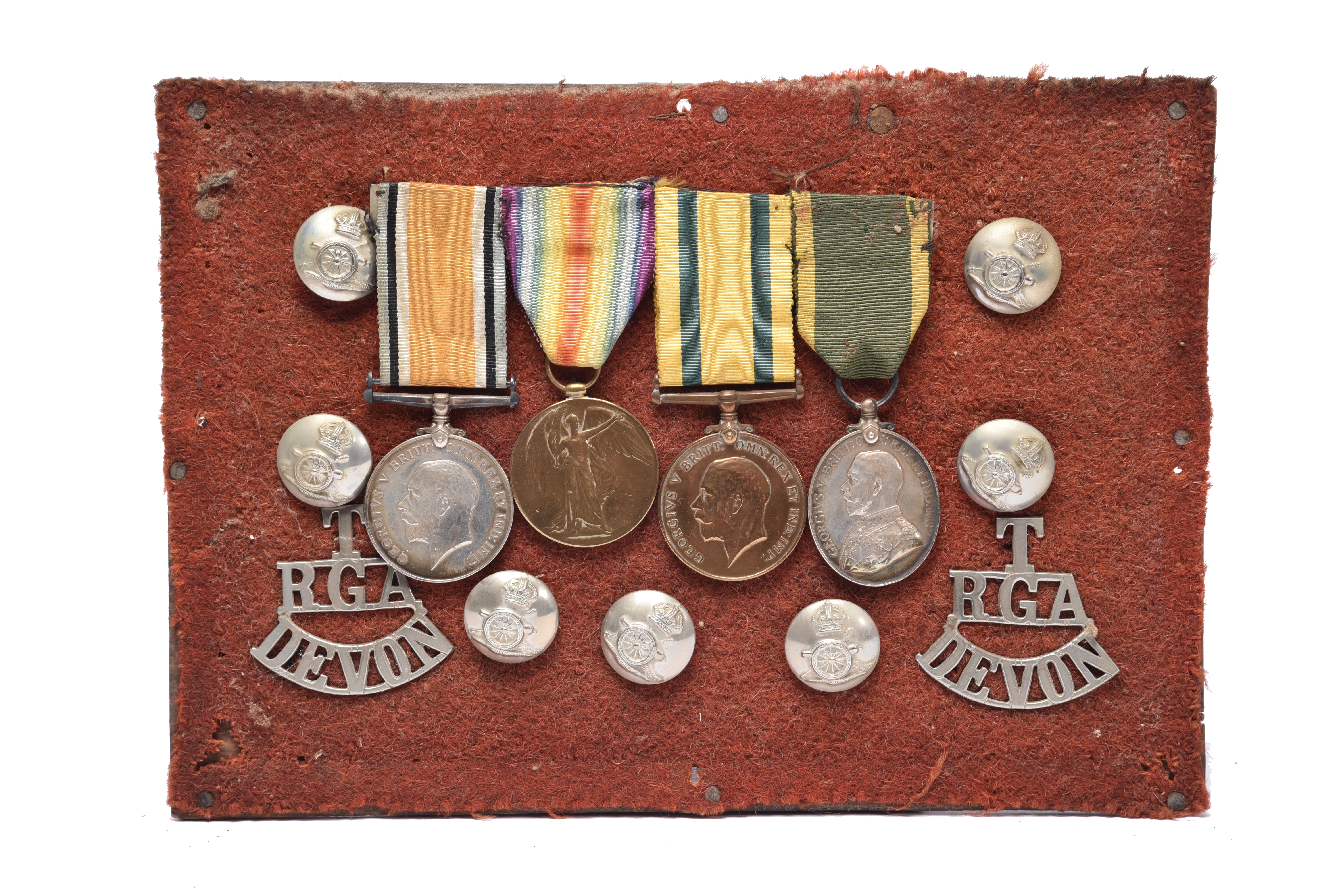 Four medal to Driver Wilfred H. Robins, Royal Artillery: British War Medal 1914-20 and Victory Medal (329030 DVR. W. H. ROBINS. R.A.); Territorial Force War Medal 1914-19 (91 DVR. W. H. ROBINS. R.A.); Territorial Efficiency Medal, George V (329030 DVR. W. ROBINS. R.G.A.), very fine [4]; in a contemporary looking oak frame with Devonshire R.G.A. shoulder titles, and R.A. buttons.