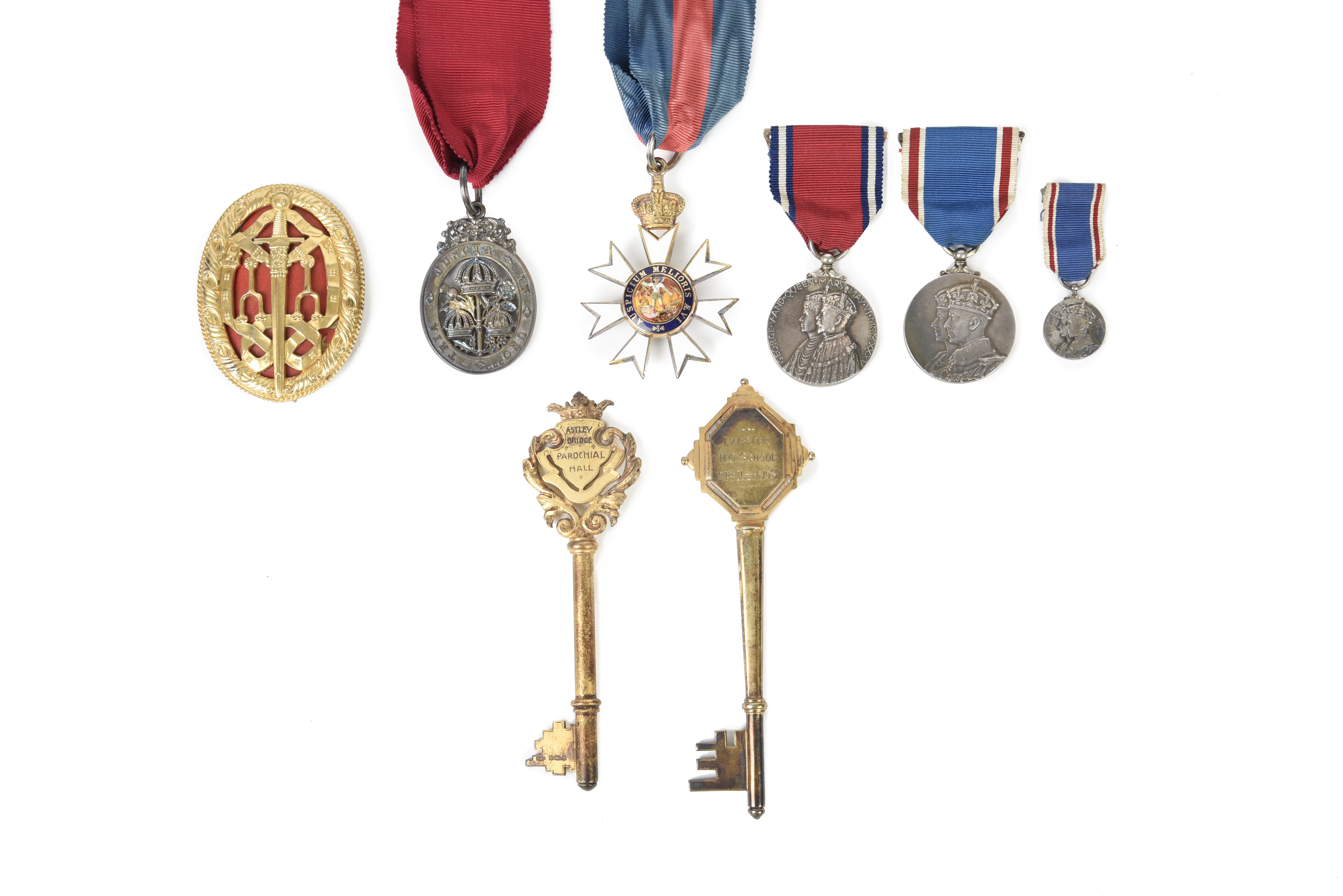 A small collection of honour insignia and similar items, comprising: a Knight Batchelor's badge, silver-gilt and enamel, in Royal Mint case of issue, London 1937, extremely fine or nearly so; The Most Honourable Order of the Bath, civil division, a companion's neck badge (C.B.), silver-gilt, by Garrard and in the maker's case of issue, London 1919, much loss to gilding, otherwise extremely fine; The Most Distinguished Order of St Michael and St George, a companion's neck badge (C.M.G.), silver-gilt and enamel, in Garrard's case of issue, about extremely fine; Jubilee Medal 1935 and Coronation Medal 1937, unnamed as issued and accompanied by a dress miniature for the latter; a ceremonial key, Astley Bridge Parochial Hall, silver-gilt, the ornate bow formed as a crowned shield supported by acanthus scrolls, inscribed 'PRESENTED TO THE RIGHT REV. LORD BISHOP OF MANCHESTER FEB. 22ND 1915', in case of issue, Marples & Beasley, Birmingham 1912; and another presentation key, Lybster H. G. School 24th March 1937, silver-gilt, stepped bow engraved 'J. W. PECK ESQ. C.B.', in case of issue, James Fenton, Birmingham 1936. [8]