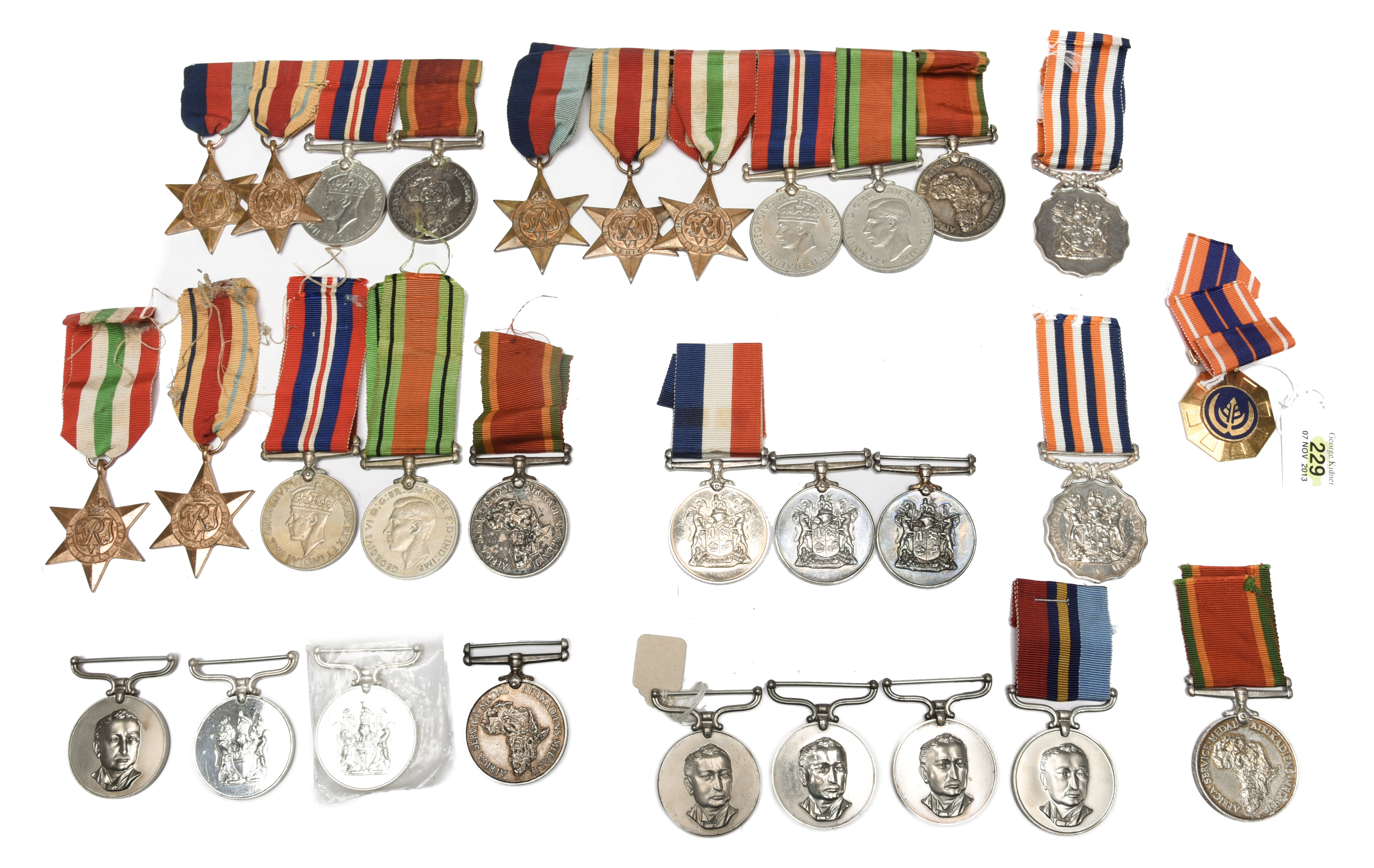A collection of South African Medals, comprising: a mounted group of six: 1939-45 Star, Africa Star, Italy Star, War Medal 1939-45, Defence Medal, Africa Service Medal 1939-45 (83528 J. FRASER); a mounted group of four: 1939-45 Star, Africa Star, War Medal 1939-45, Africa Service Medal 1939-45 (3216 A. C. O'BRIEN); a group of five: Africa Star, Italy Star, Defence Medal, War Medal 1939-45, Africa Service Medal 1939-45 (30146 T. FLINT); three pairs of War Medal and Africa Service Medal 1939-45, with copy research (M10923 I. DANIELS / 143997 G. L. LANGRIDGE / 140830 J. C. DAVIDSON); two single Africa Service Medals, with copy research (543271 J. S. FOURIE / C301753 E. PULLEN); two further Africa Service Medals (N3661 D. DUBE / 115390 G. VAN DER MERWE); three South African Medals for War Service 1939-46, unnamed as issued; four Rhodesia General Service Medals (20747 CONST. MAFUKIDZE / PR21564 SPR. J. P. BERRY / 13844 D/CONST AMOS / PR5526 CPL. P. NEAUM); a Union Medal (92); a Permanent Force Good Service Medal (843); a Pro Patria Medal, link suspension (7964); and three various specimens medals; all at least very fine, Fourie's medal with officially altered number [qty]