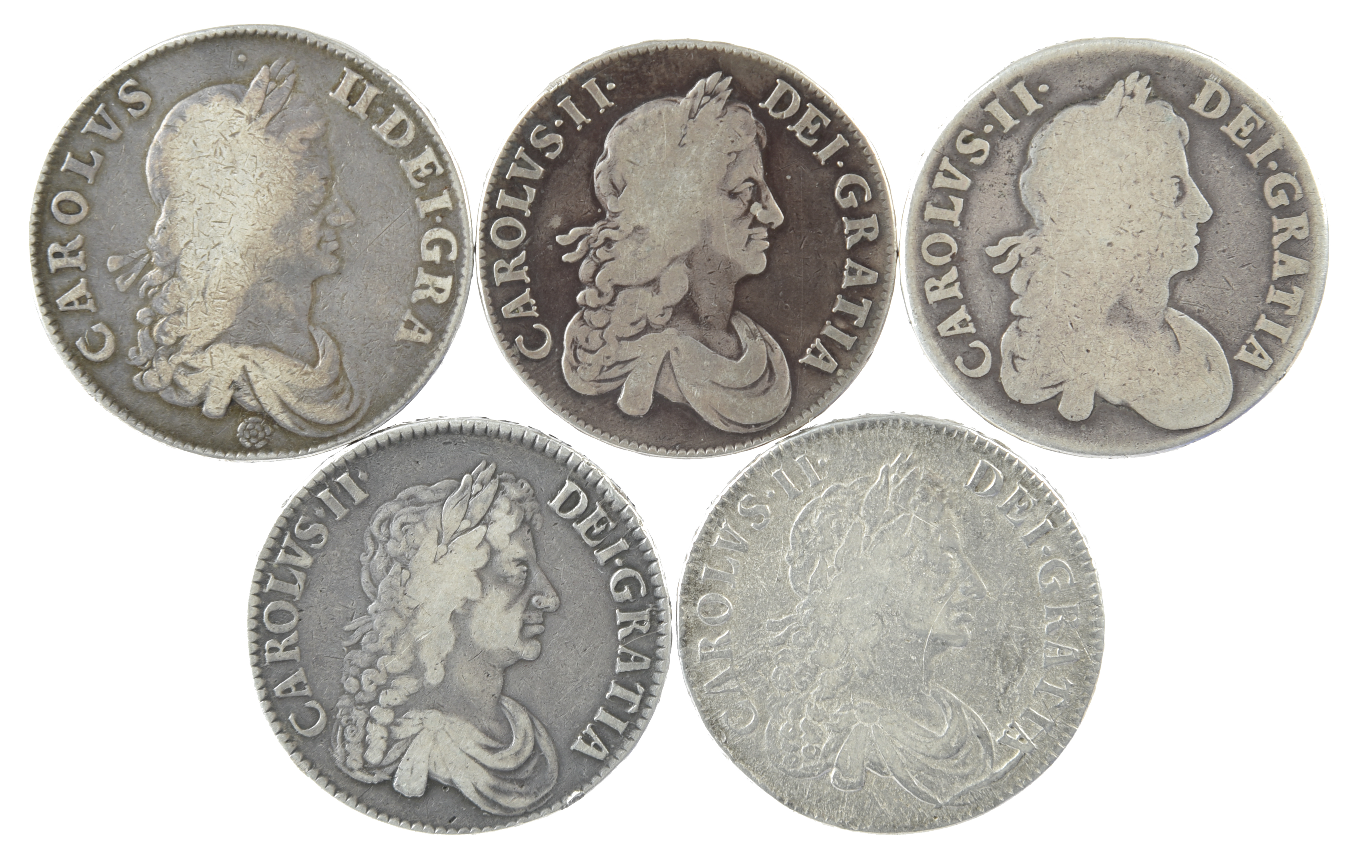 Charles II, silver crowns (5): 1662, first bust with rose below, undated edge (S 3350), fair to fine; 1664, second bust, edge XVI (S 3355), near fine, reverse better; 1668 (S 3357), good fair; 1671, third bust, edge V. TERTIO (S 3358), good fine; 1672 (S 3358), fine. [5]
