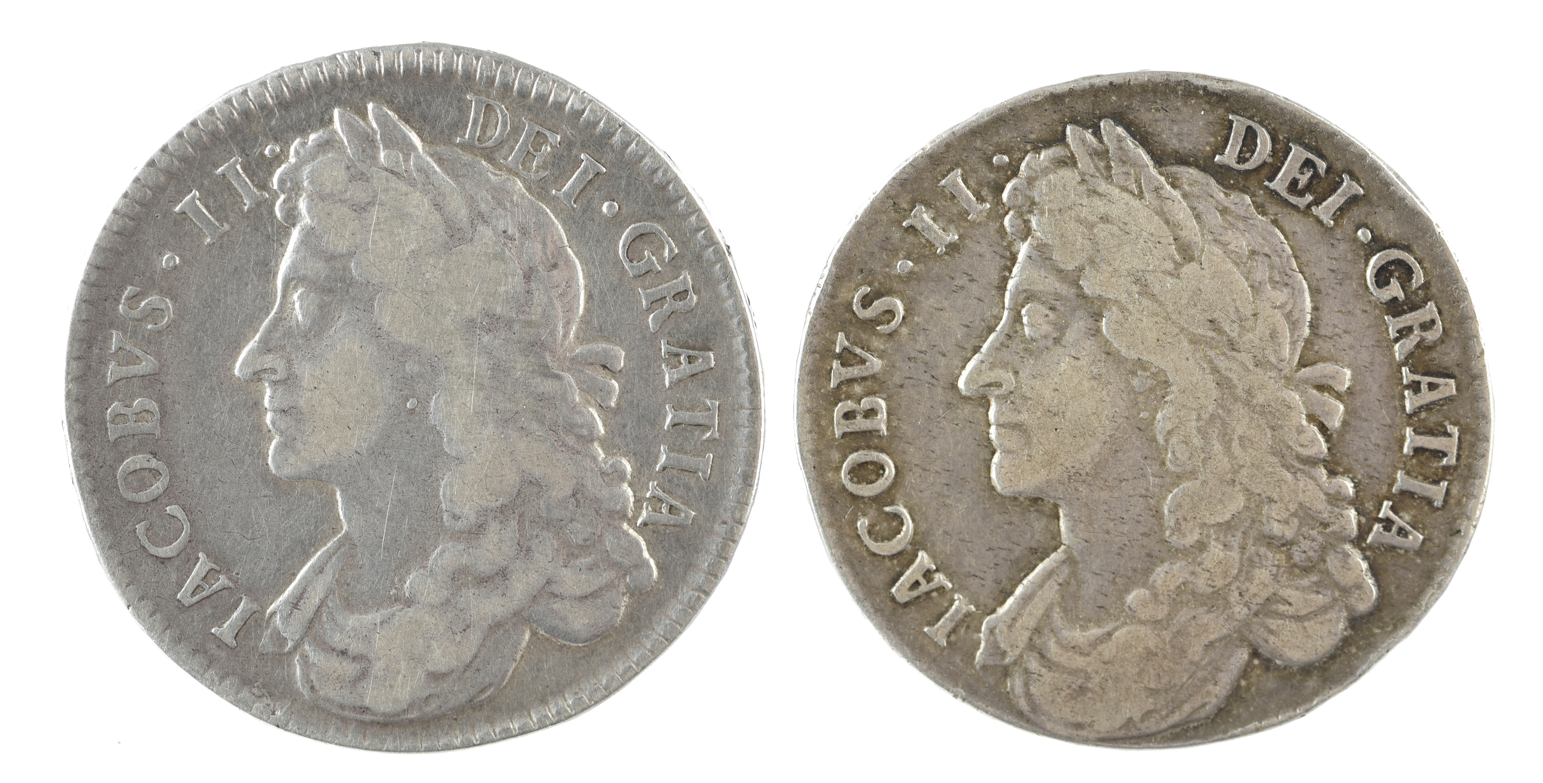 James II, silver half crowns (2): 1686, first bust, edge SECUNDO; 1687, edge TERTIO (S 3408), each at least good fine. [2]