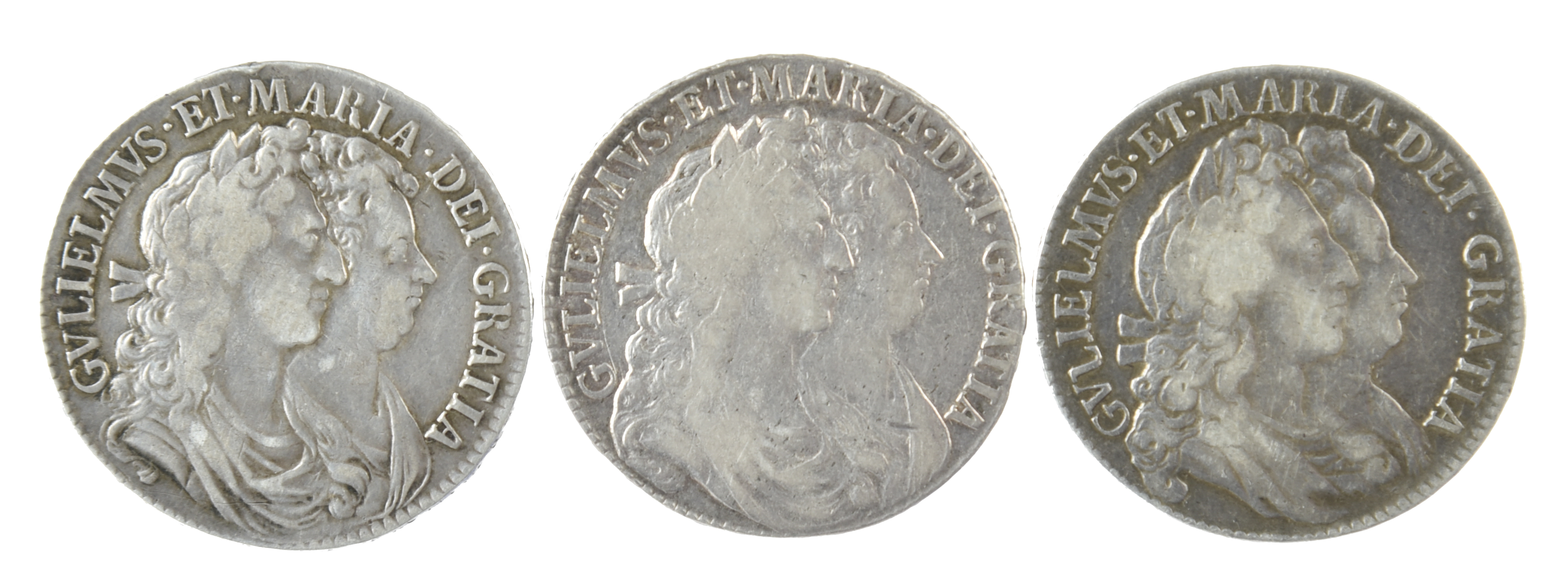 William and Mary, silver halfcrowns (3): 1689 (2), first conjoined busts (S 3434), one very fine or nearly so, the other good fine, reverse better; 1692, second busts, edge QVARTO (S 3436), near very fine, reverse better. [3]