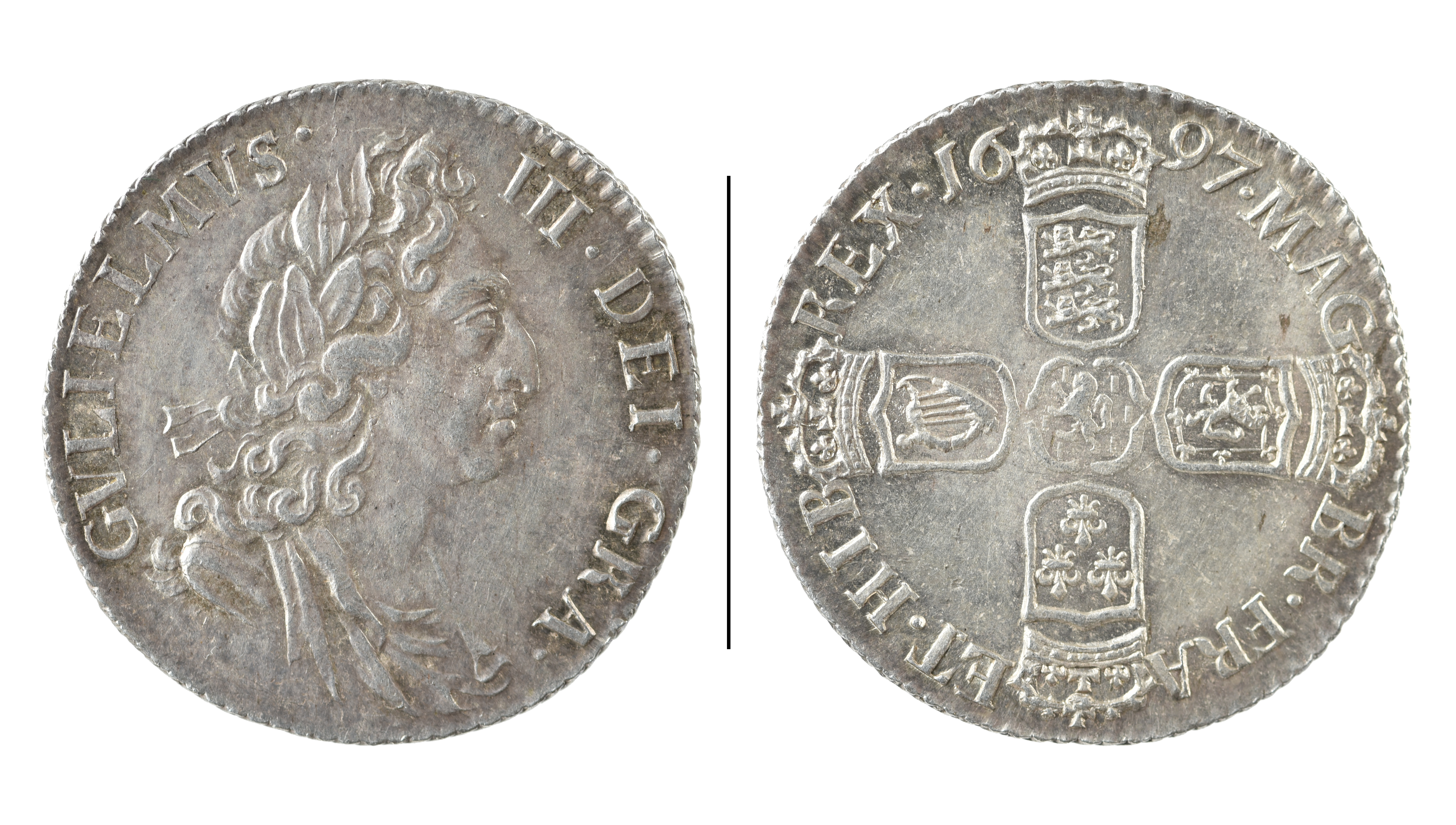 William III, silver sixpence, 1697, third bust, later harp, large crowns (S 3538), about extremely fine.